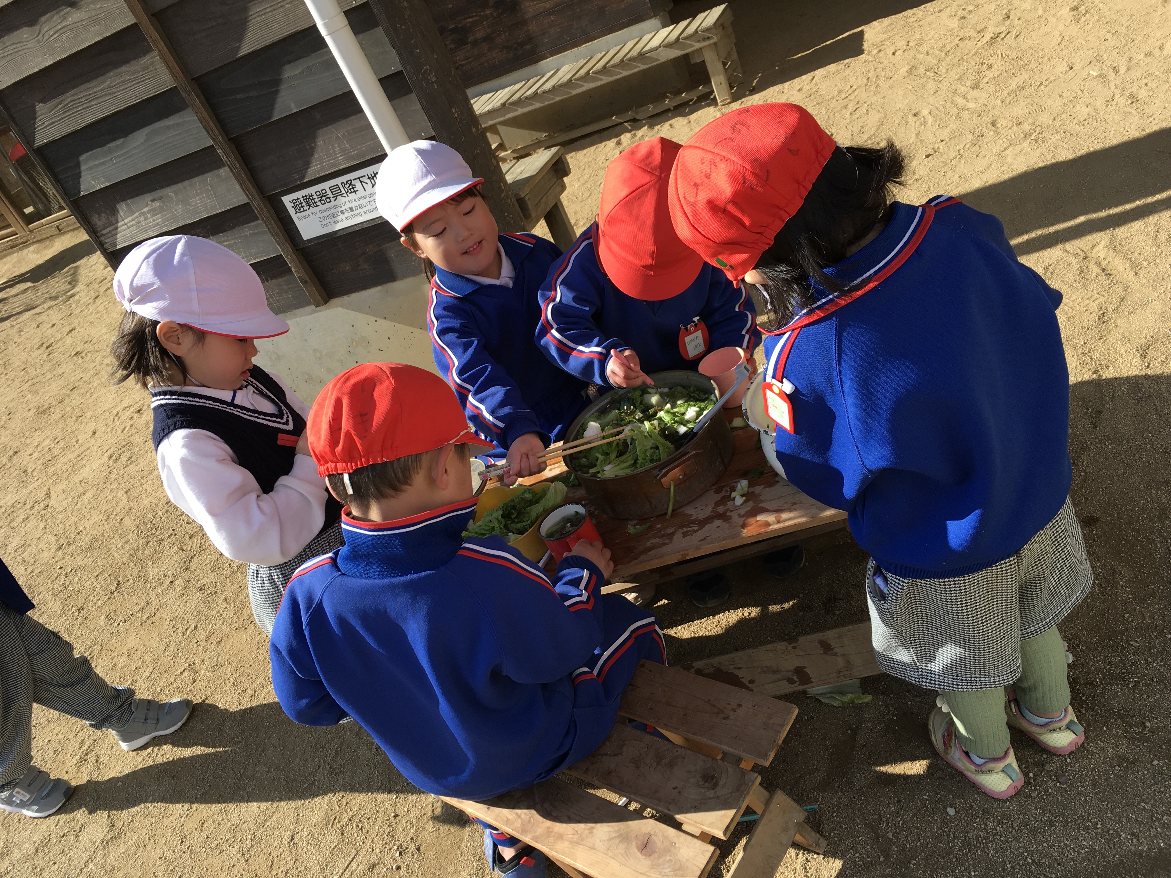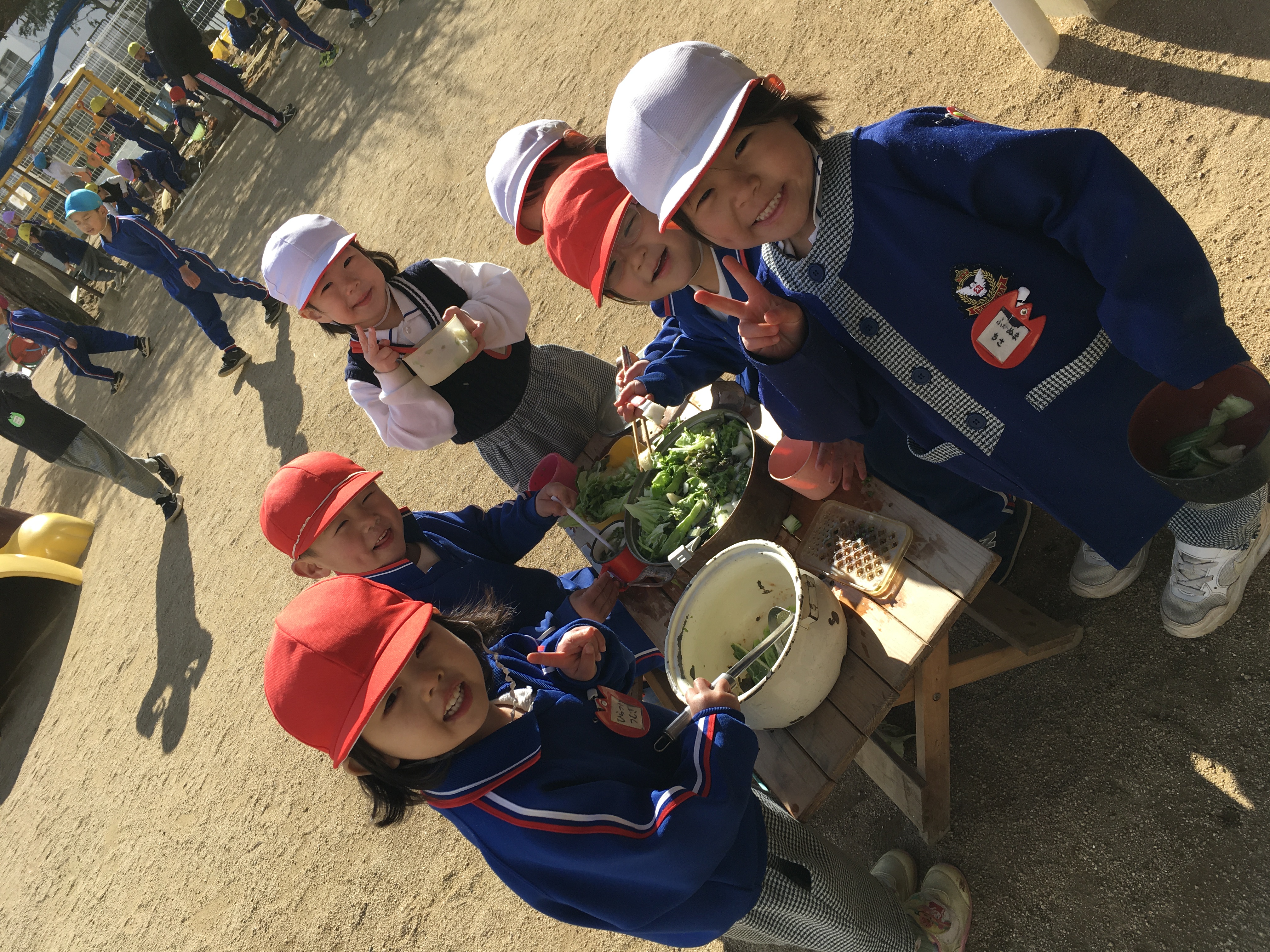 風が吹いて肌寒さを感じる今朝、園庭のままごとコーナーでは、ちゅうりっぷ組の子ども達が野菜がたくさん入った鍋をかこんで、「なべパーティー♪」と言って、自分達で作った鍋料理を食べて楽しんでいました。