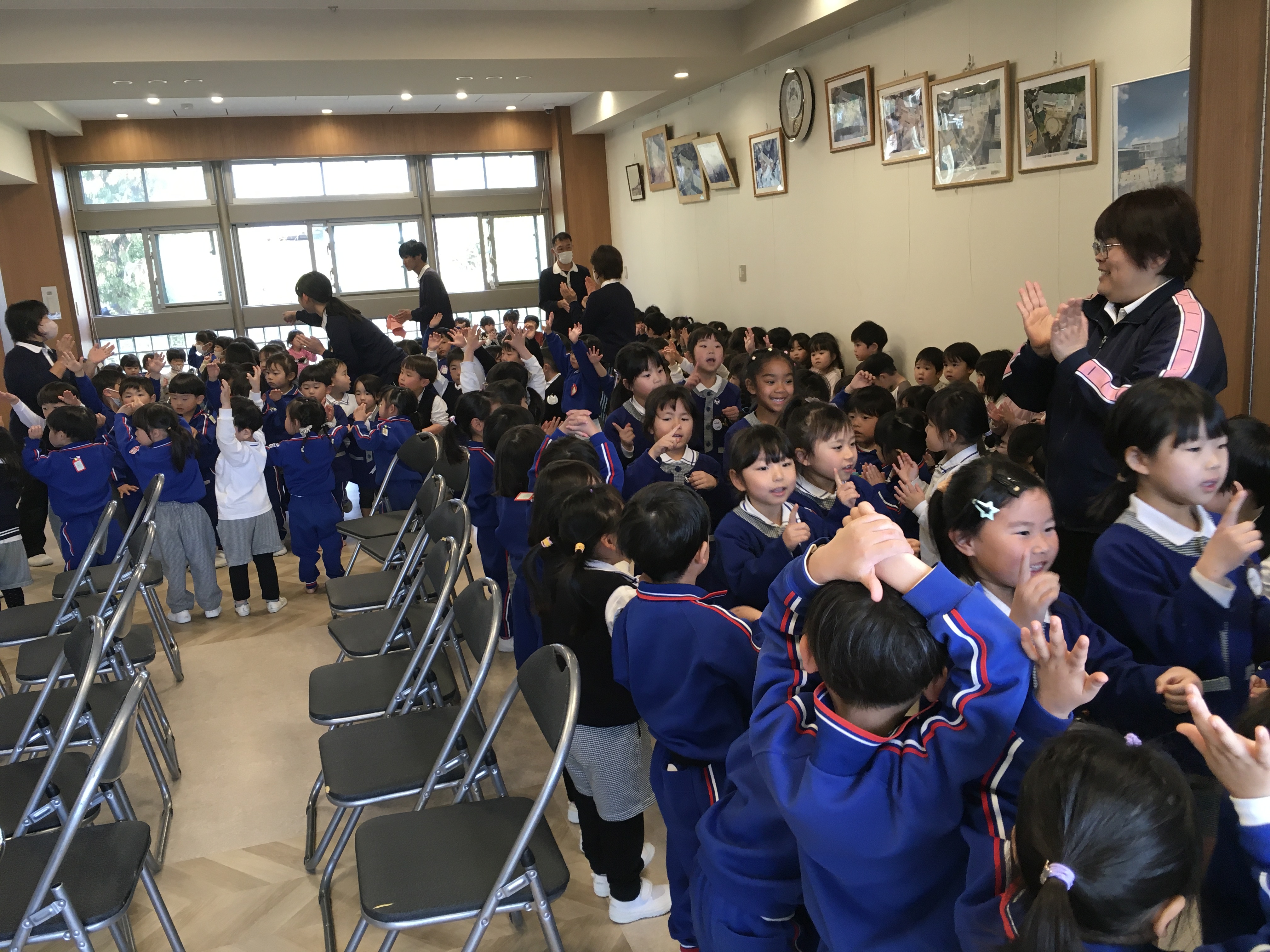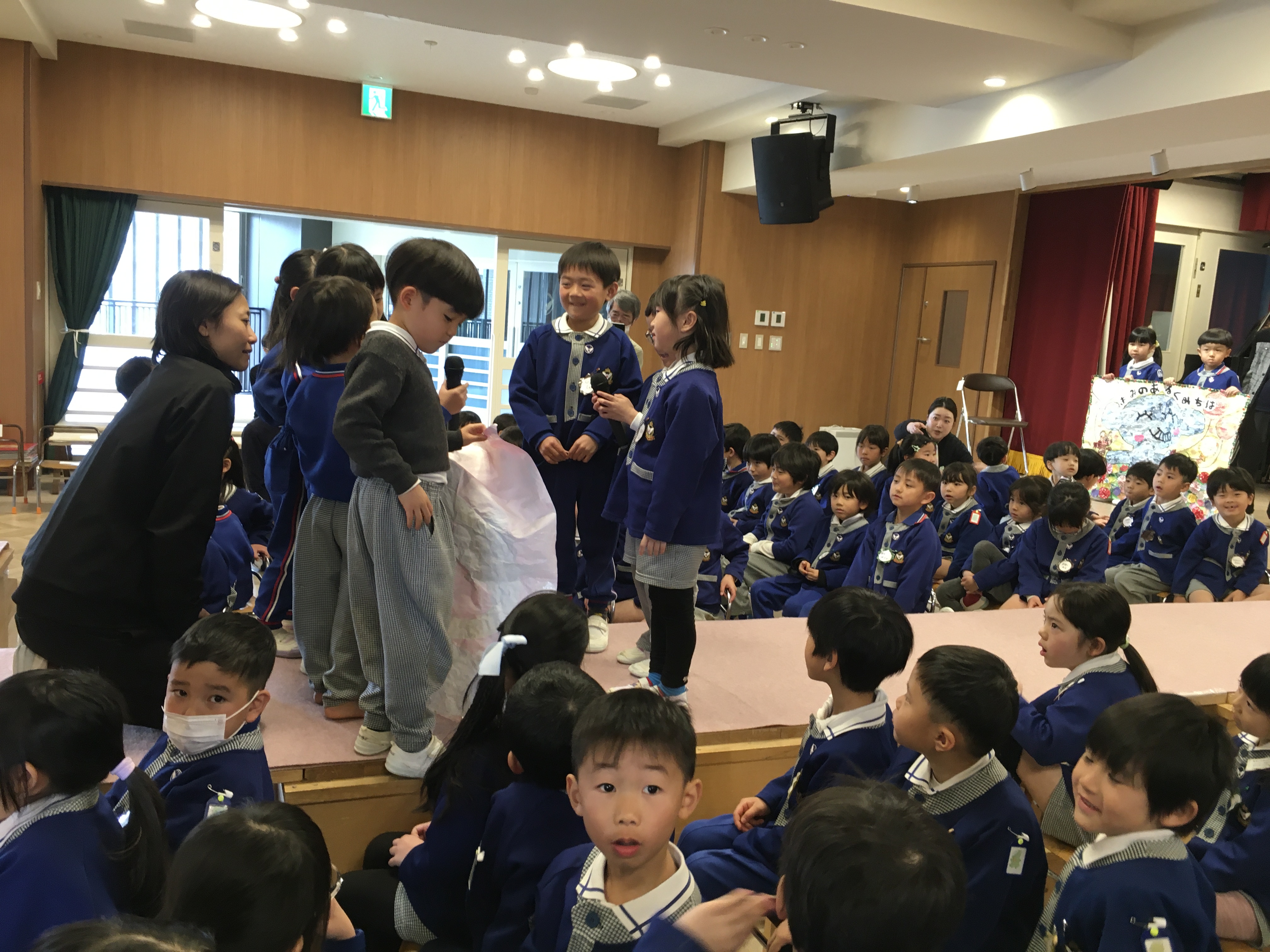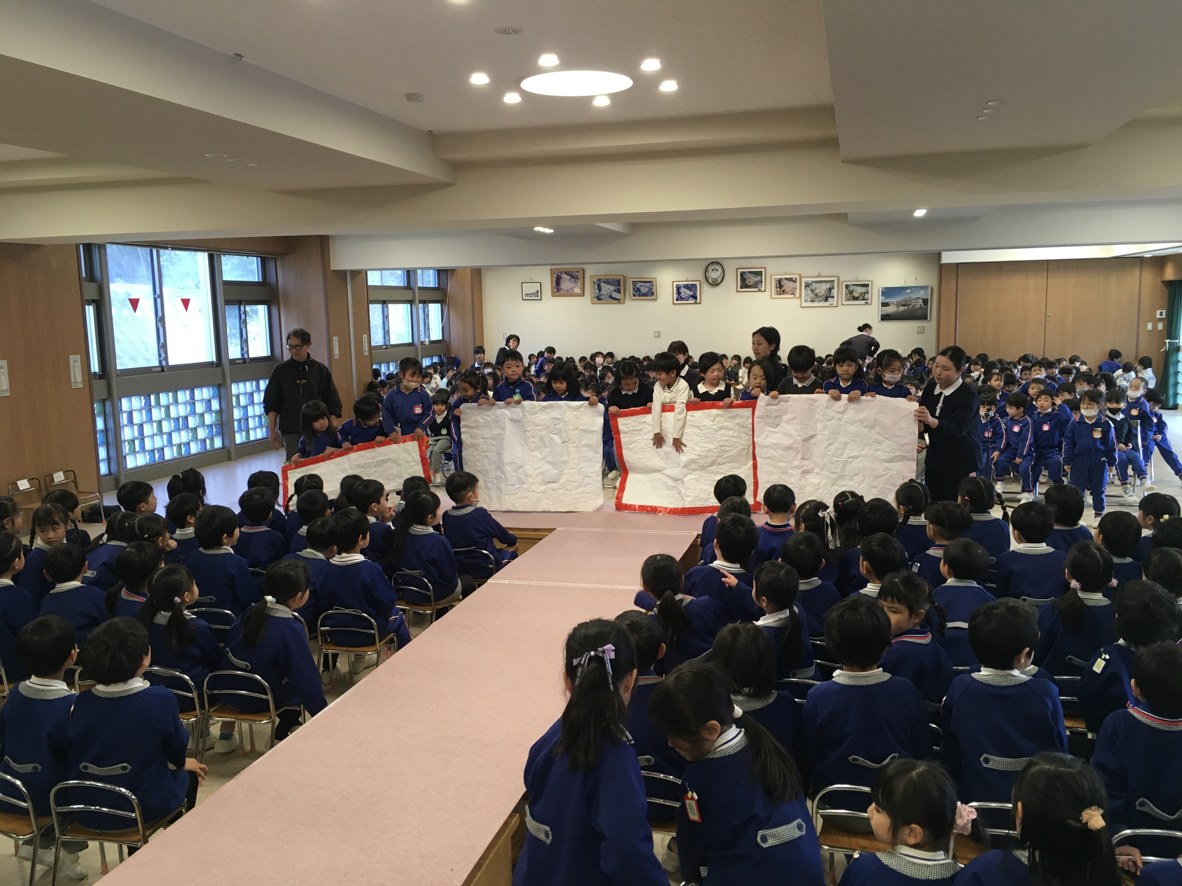 「練習はこれで終わります」と言った瞬間「ちょっと待ってください!」とドキドキしながら年中児が声を上げました。年長さんがざわざわしている間に年中の代表の子達が花道に上がって「せーの!!」で絵を見せた瞬間「わ~!!」「かわいい~!!」と歓声と拍手が起こりました。すると、古森先生が、「文字を読んでみて」と4枚の絵を順番に読むとある歌の歌詞になっていることに気付いてくれました。「すてきー!!」とさらに喜んでくれて、絵のプレゼントは大成功!!「小学校に行っても頑張ってね」「風邪をひかないようにお勉強頑張ってね!」等々、たくさんの気持ちを伝えることができました。他にもたくさんお伝えしたいことがありますが、お楽しみがなくなるのでここまでにしておきます。