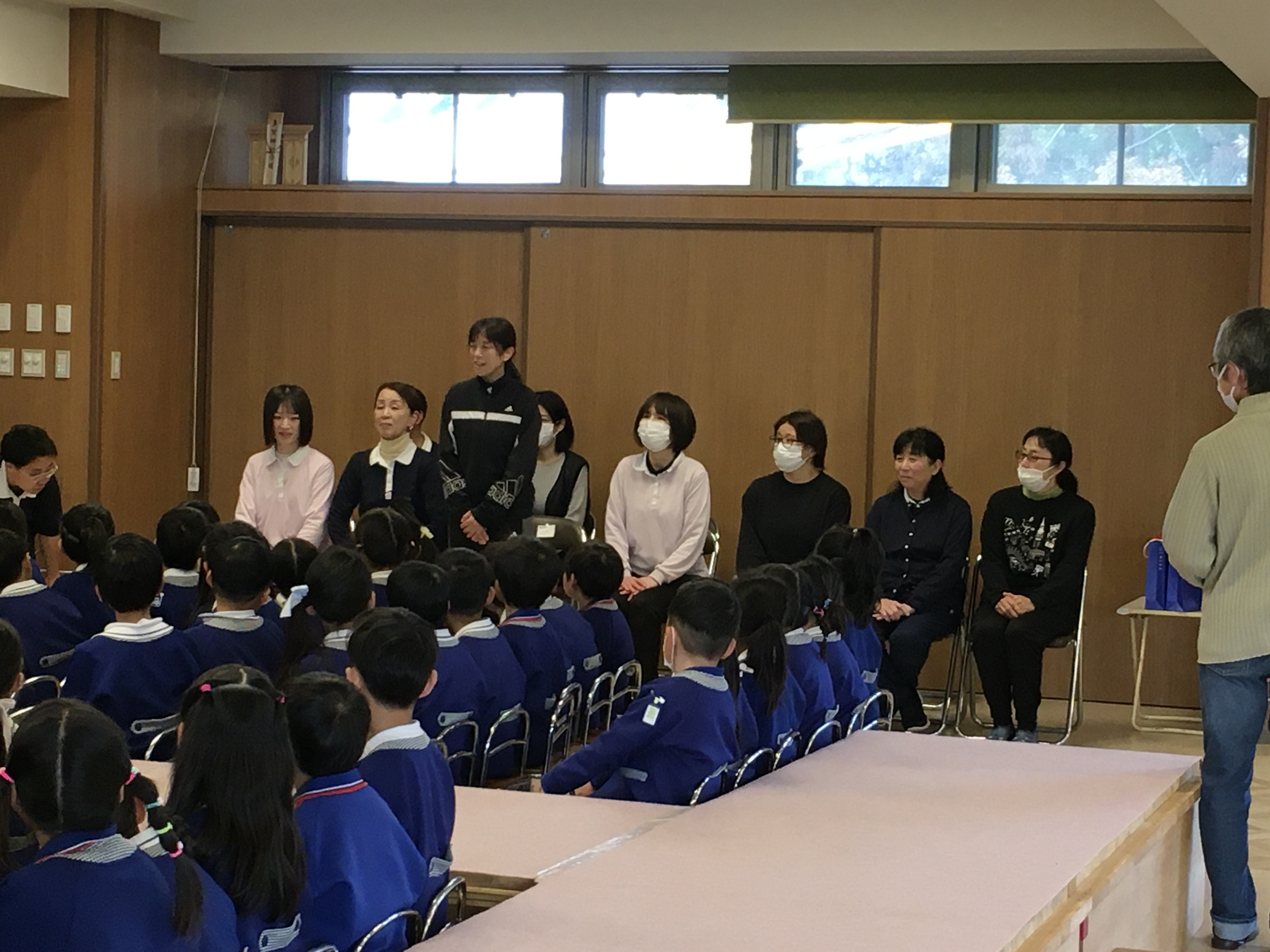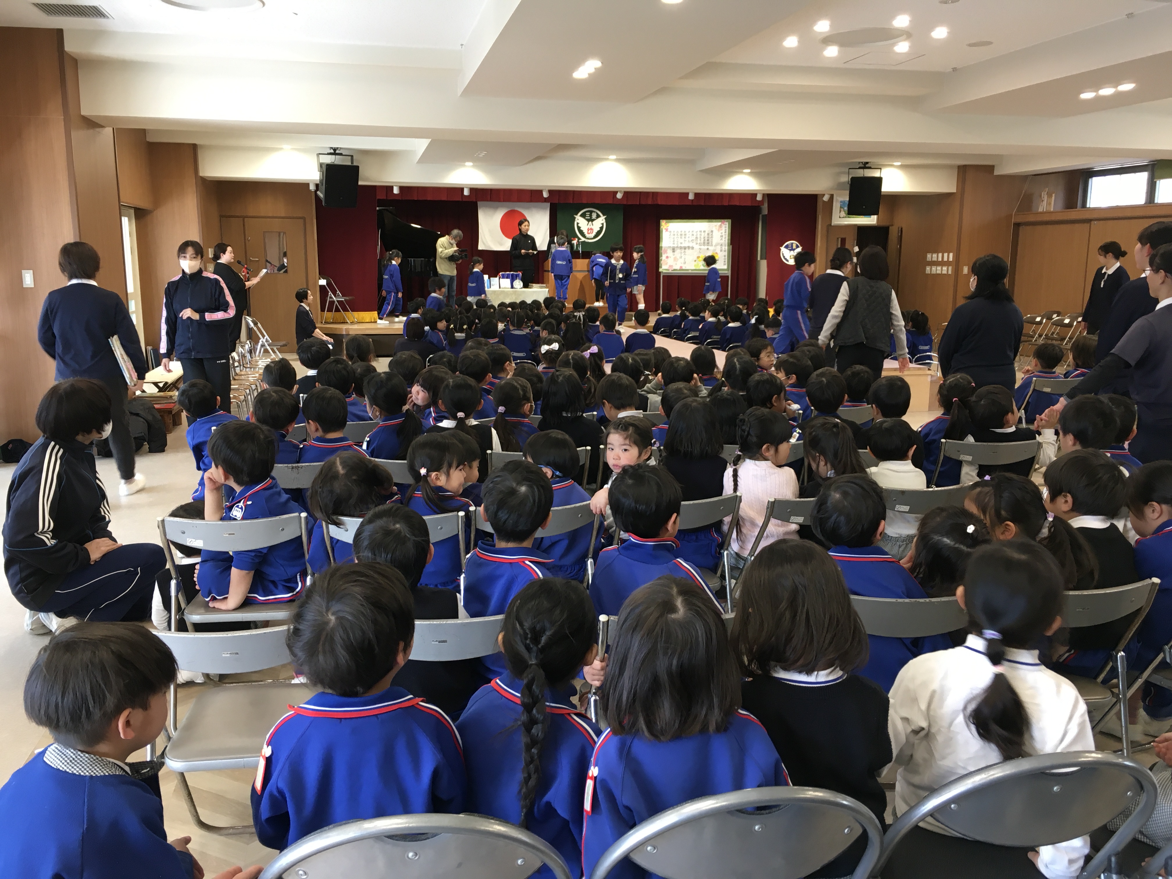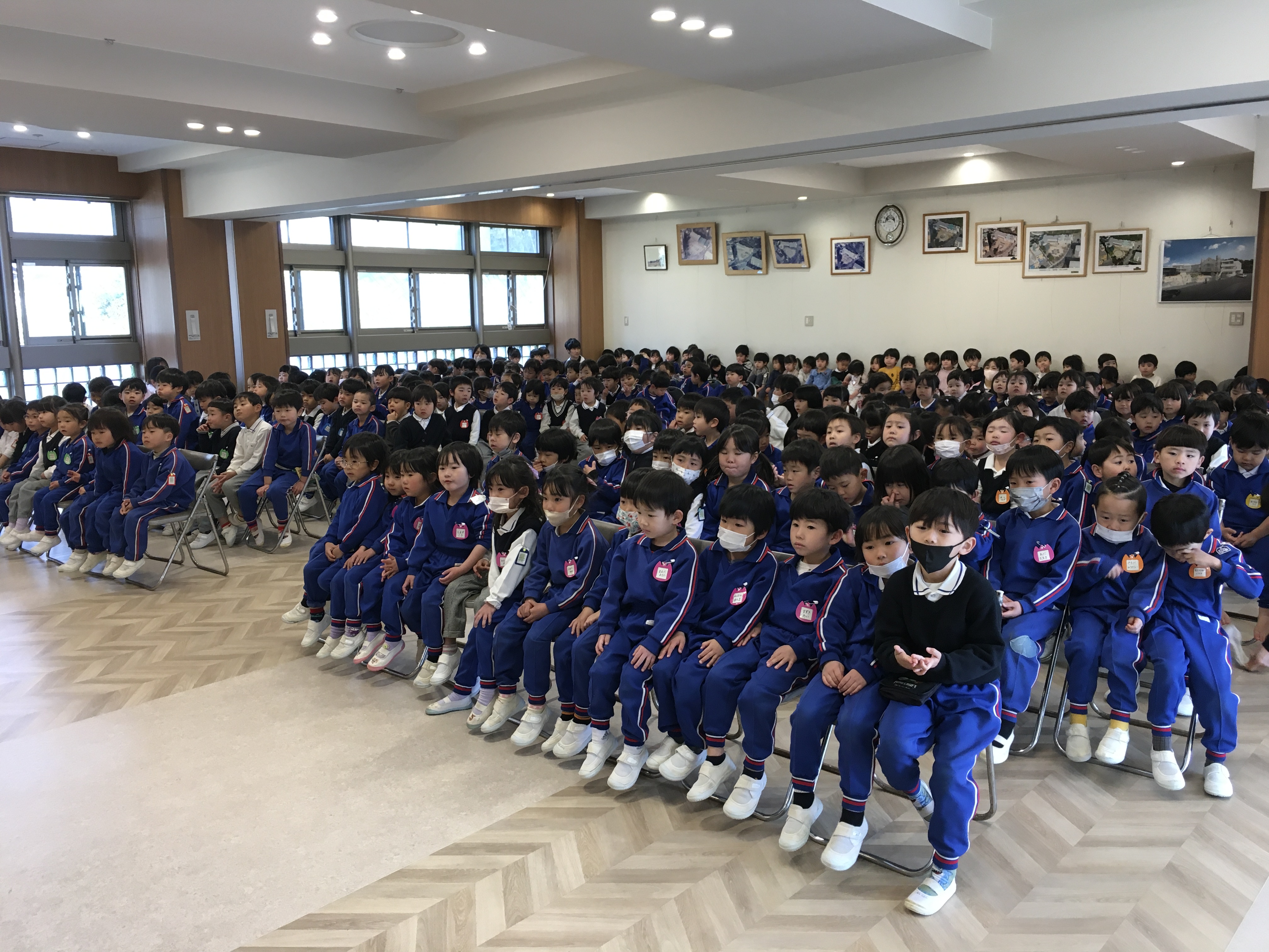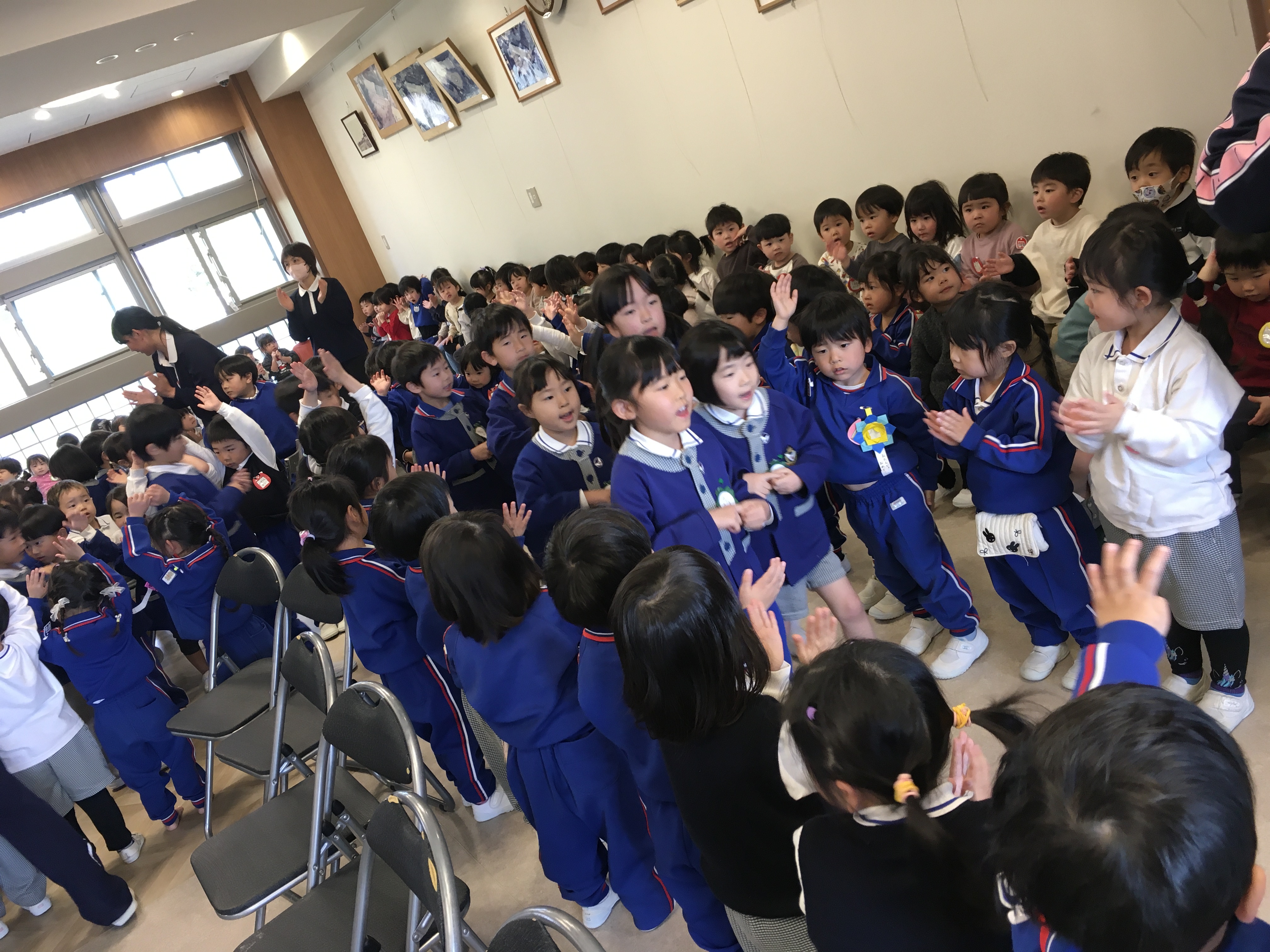「練習はこれで終わります」と言った瞬間「ちょっと待ってください!」とドキドキしながら年中児が声を上げました。年長さんがざわざわしている間に年中の代表の子達が花道に上がって「せーの!!」で絵を見せた瞬間「わ~!!」「かわいい~!!」と歓声と拍手が起こりました。すると、古森先生が、「文字を読んでみて」と4枚の絵を順番に読むとある歌の歌詞になっていることに気付いてくれました。「すてきー!!」とさらに喜んでくれて、絵のプレゼントは大成功!!「小学校に行っても頑張ってね」「風邪をひかないようにお勉強頑張ってね!」等々、たくさんの気持ちを伝えることができました。他にもたくさんお伝えしたいことがありますが、お楽しみがなくなるのでここまでにしておきます。