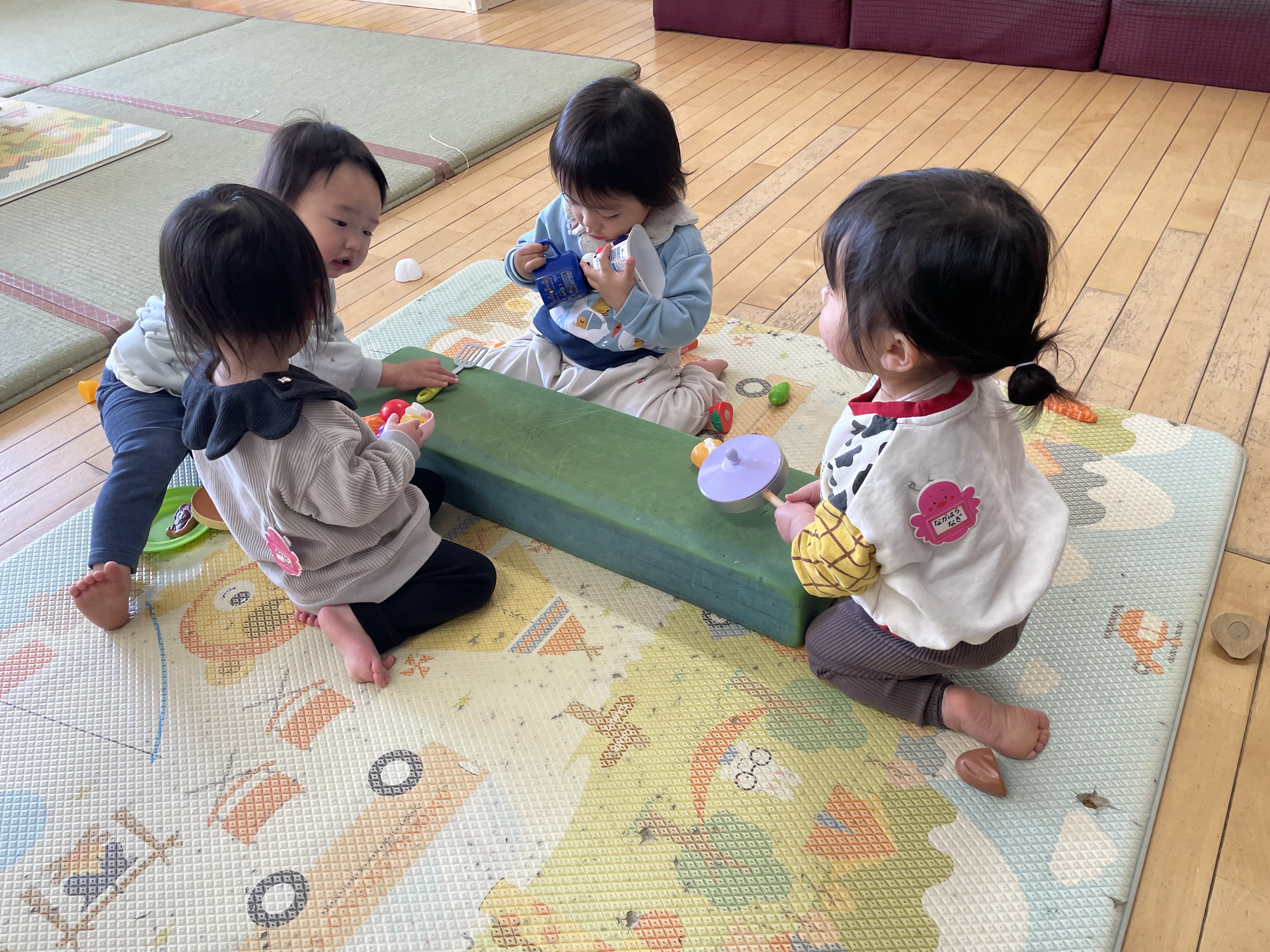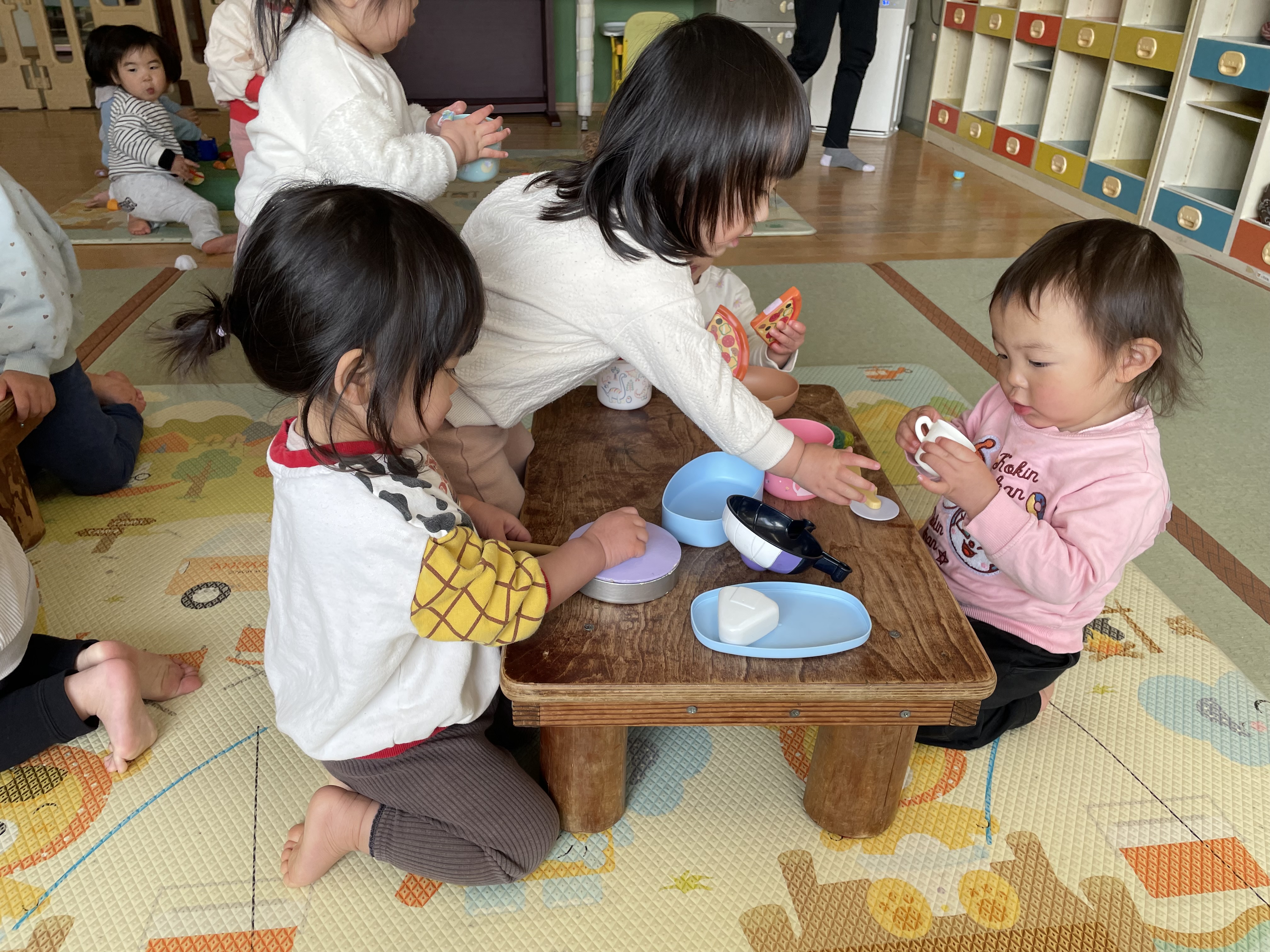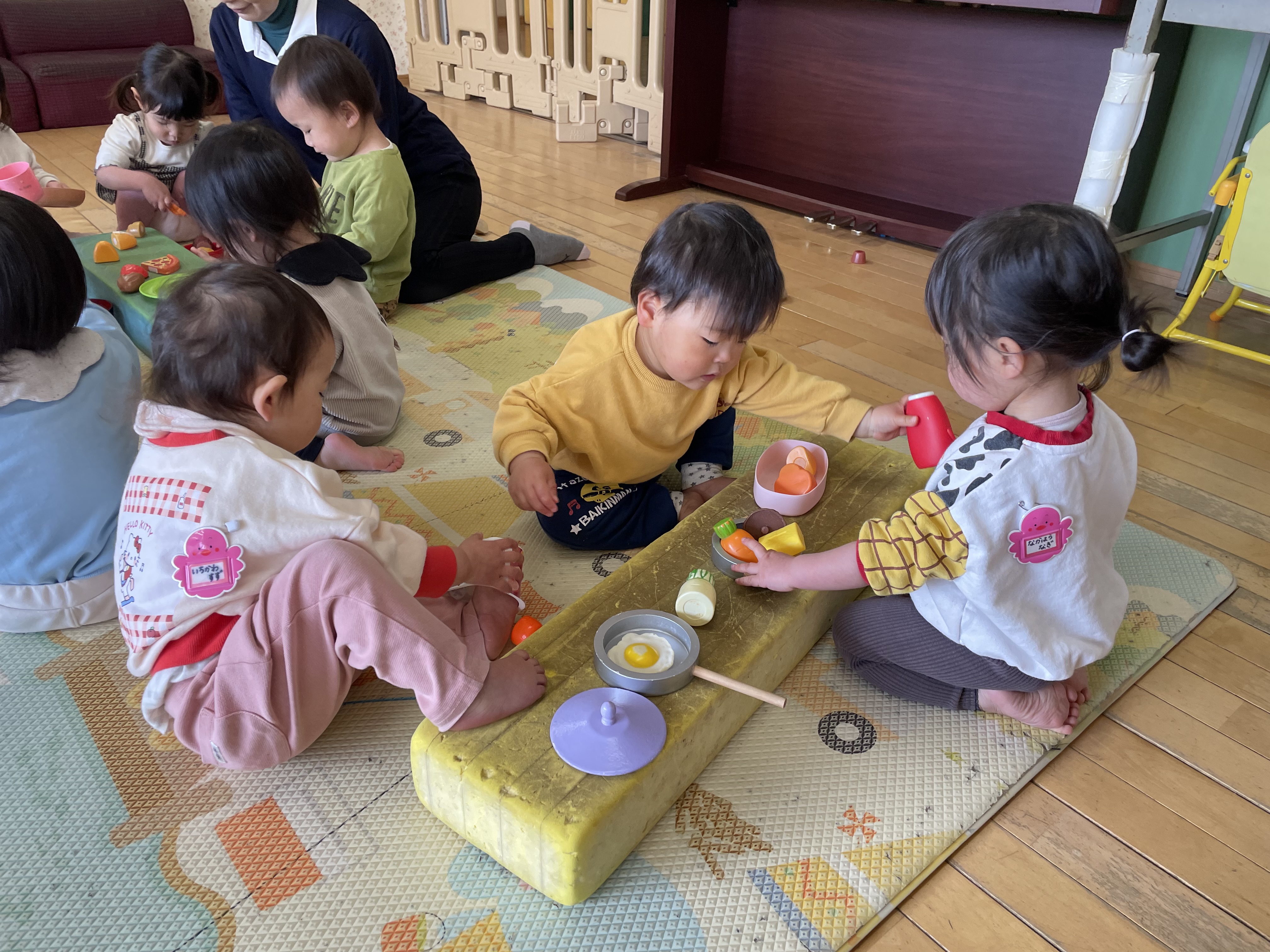 今年度も残す所後1週間となり、入園した頃はたくさん涙が出ていた子ども達が今ではしっかり者に成長している事をとても嬉しく感じます。この1年でたくさんの初めてを経験したもも組の子ども達は、いろいろな事が出来るようになりました。ままごとのおもちゃを出すと、お皿の大きさや形を考えたり、盛り付け方を考えたりするようになりました。Mちゃんはロッカーをレンジに見立てて、「ピッ!」と言いながらボタンを押していました。出来上がると「できたよ!」とゆっくり取り出して、保育教諭の所へ持って来てくれました。Rちゃんは、電子ピアノのコードを引っ掛けるフックを見付けると、ドリンクバー?ウォーターサーバー?の様にして何回もコップを持って来て汲んでいました。たくさんの見立て遊びが出来るようになり、他の子ども達もその姿を見て学んでいきます。初めての事や、出来ない事も興味を持っている事には触れさせ、援助していきたいと思っています。