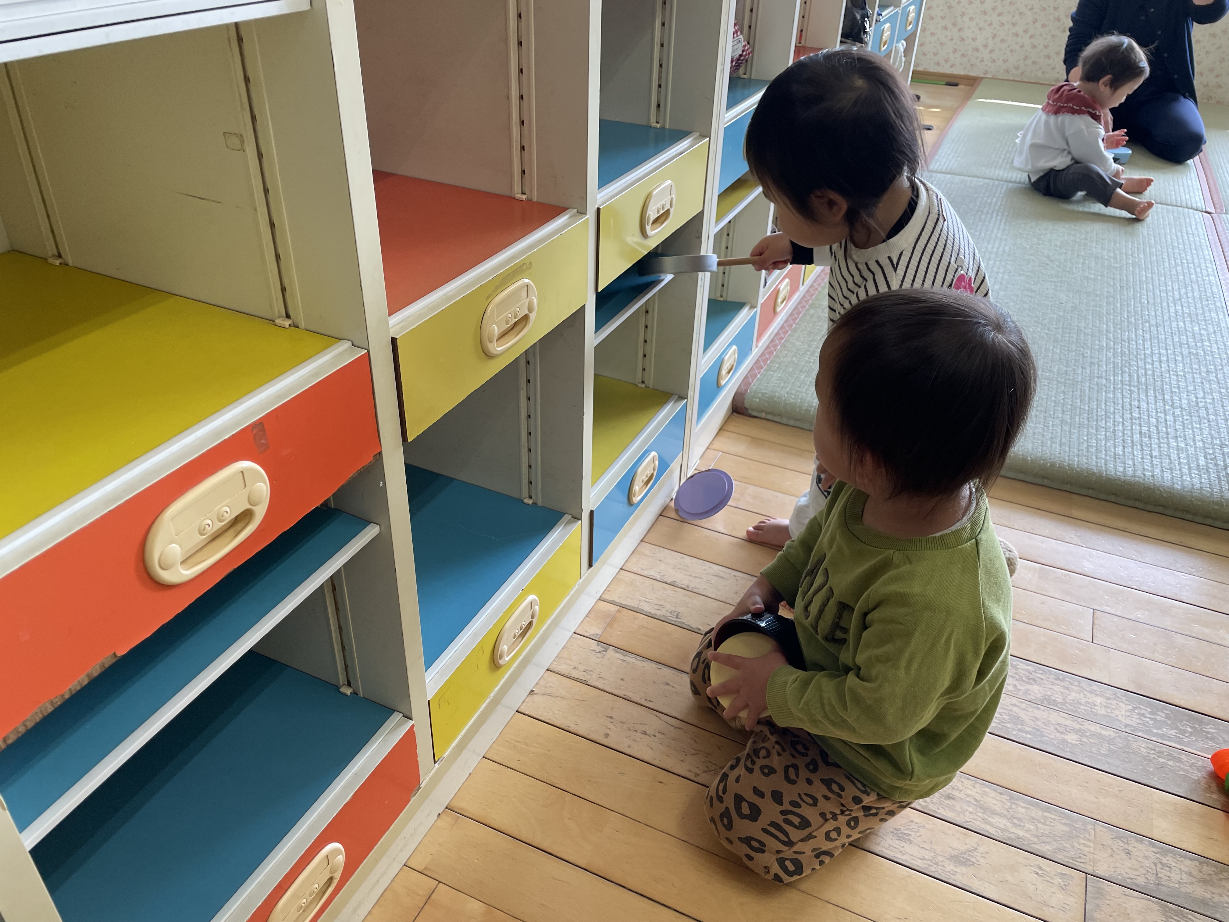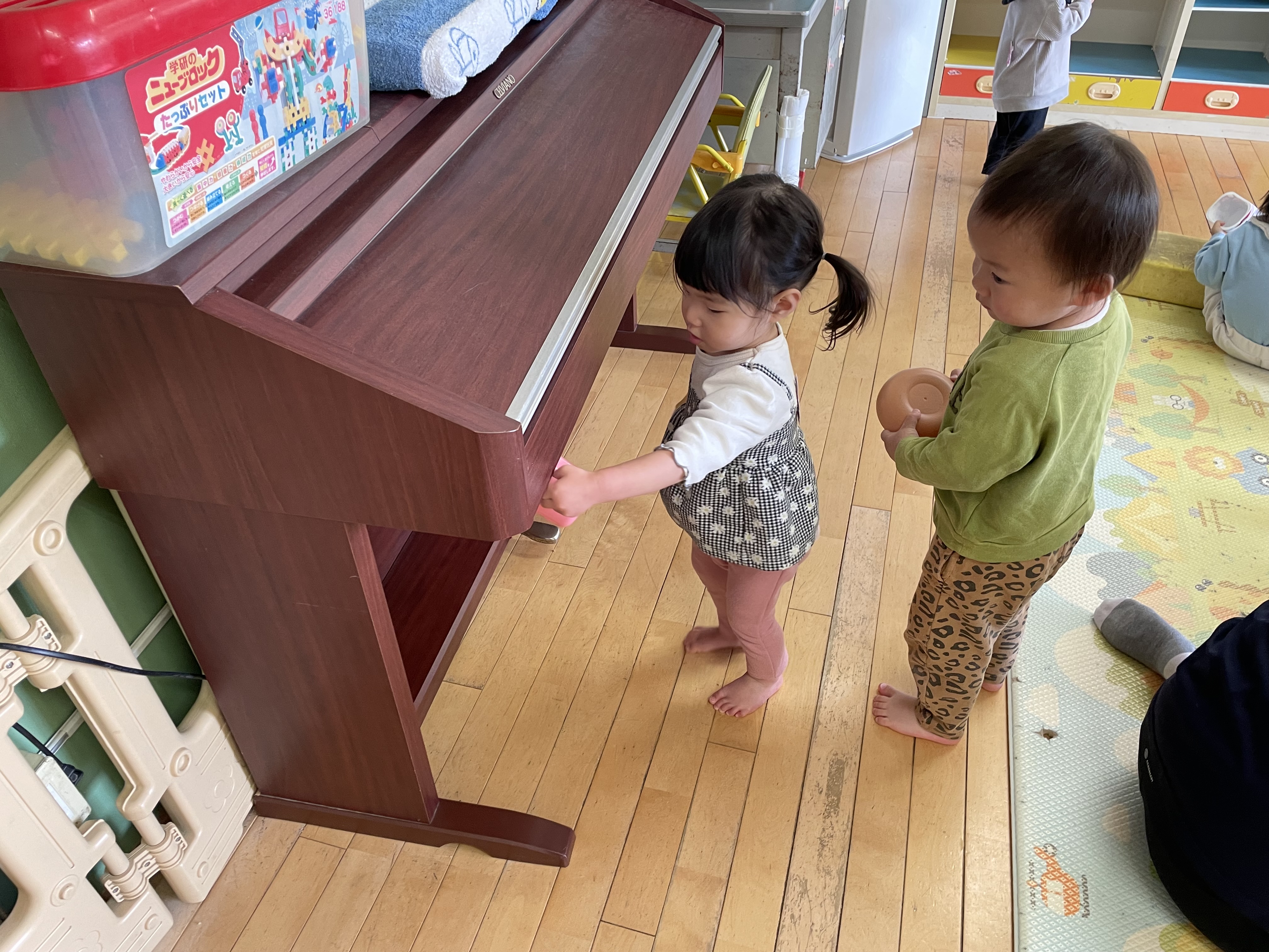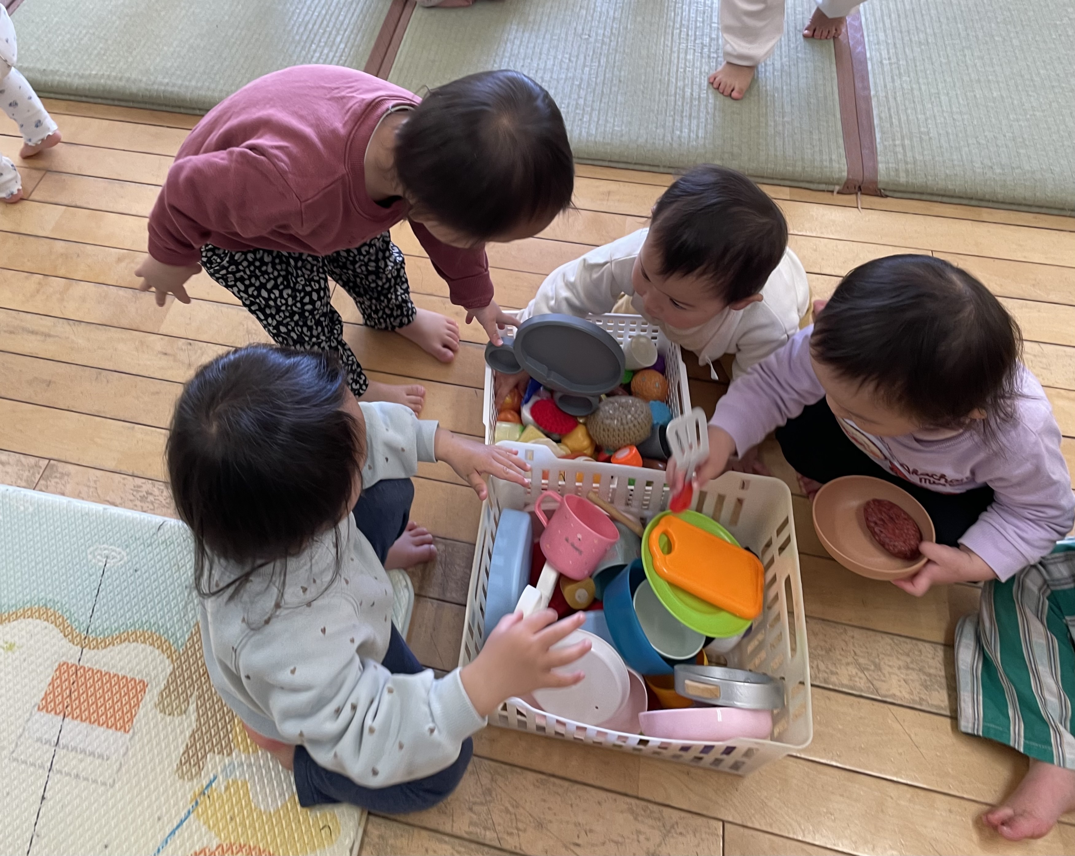 今年度も残す所後1週間となり、入園した頃はたくさん涙が出ていた子ども達が今ではしっかり者に成長している事をとても嬉しく感じます。この1年でたくさんの初めてを経験したもも組の子ども達は、いろいろな事が出来るようになりました。ままごとのおもちゃを出すと、お皿の大きさや形を考えたり、盛り付け方を考えたりするようになりました。Mちゃんはロッカーをレンジに見立てて、「ピッ!」と言いながらボタンを押していました。出来上がると「できたよ!」とゆっくり取り出して、保育教諭の所へ持って来てくれました。Rちゃんは、電子ピアノのコードを引っ掛けるフックを見付けると、ドリンクバー?ウォーターサーバー?の様にして何回もコップを持って来て汲んでいました。たくさんの見立て遊びが出来るようになり、他の子ども達もその姿を見て学んでいきます。初めての事や、出来ない事も興味を持っている事には触れさせ、援助していきたいと思っています。