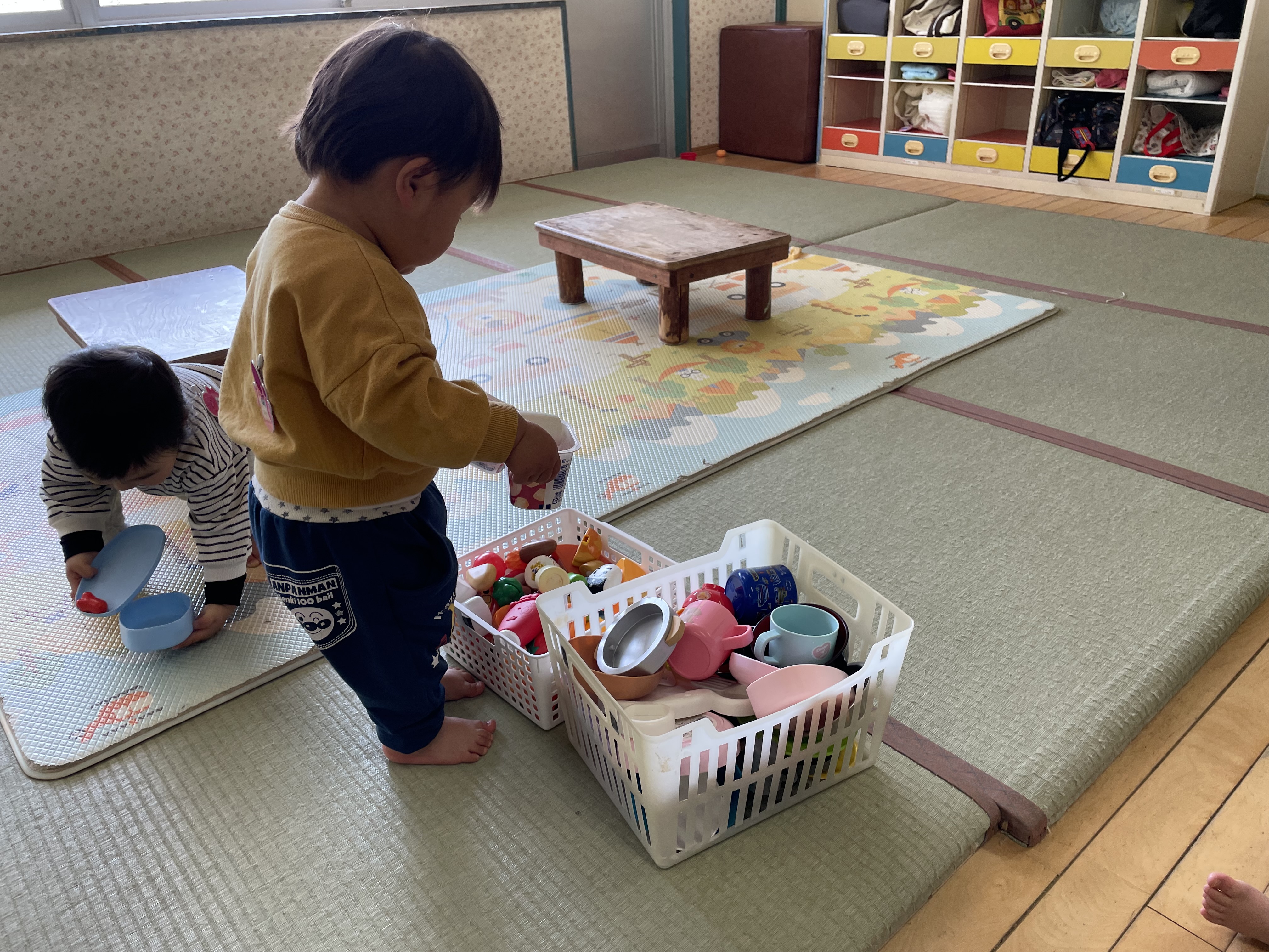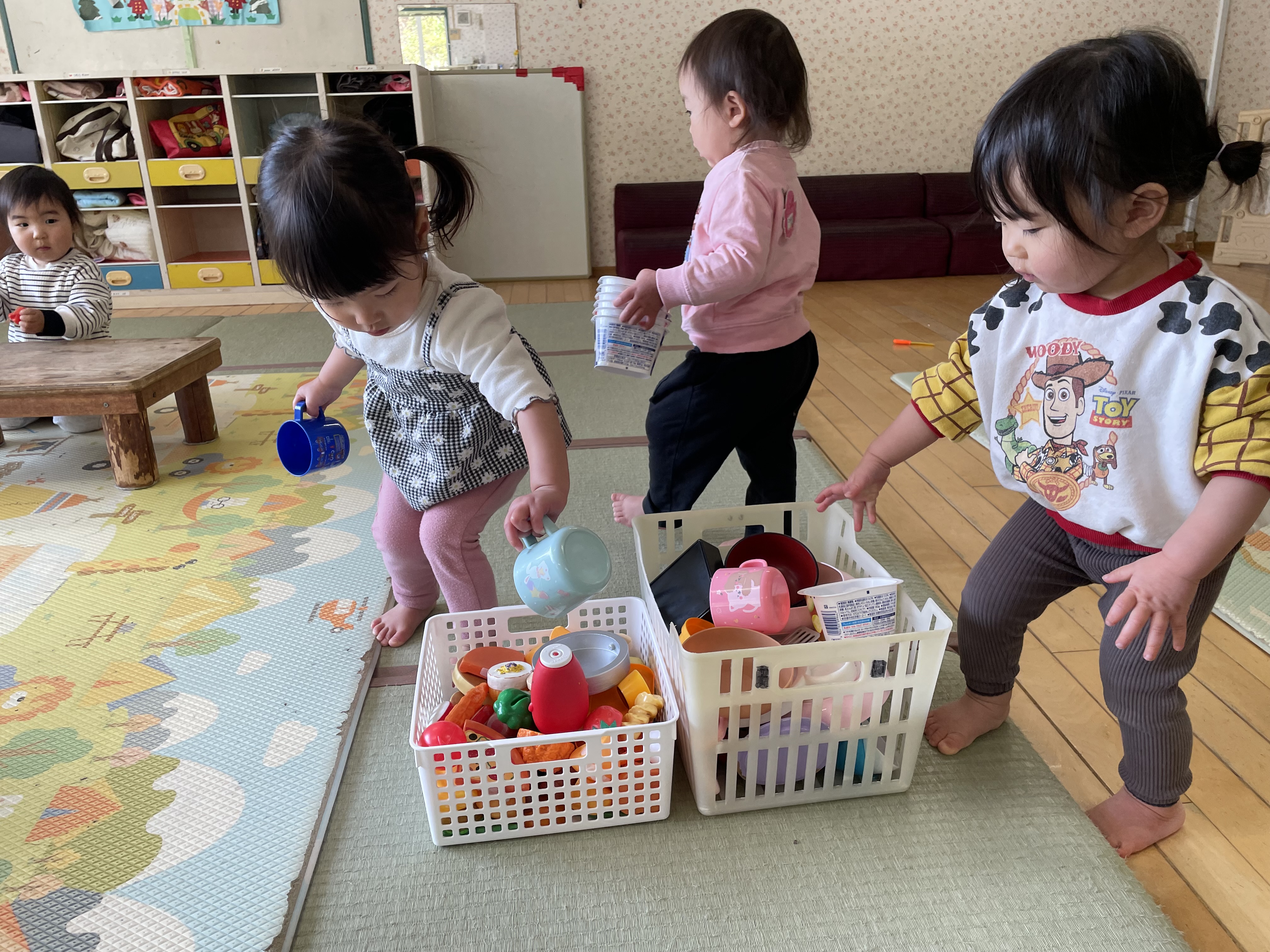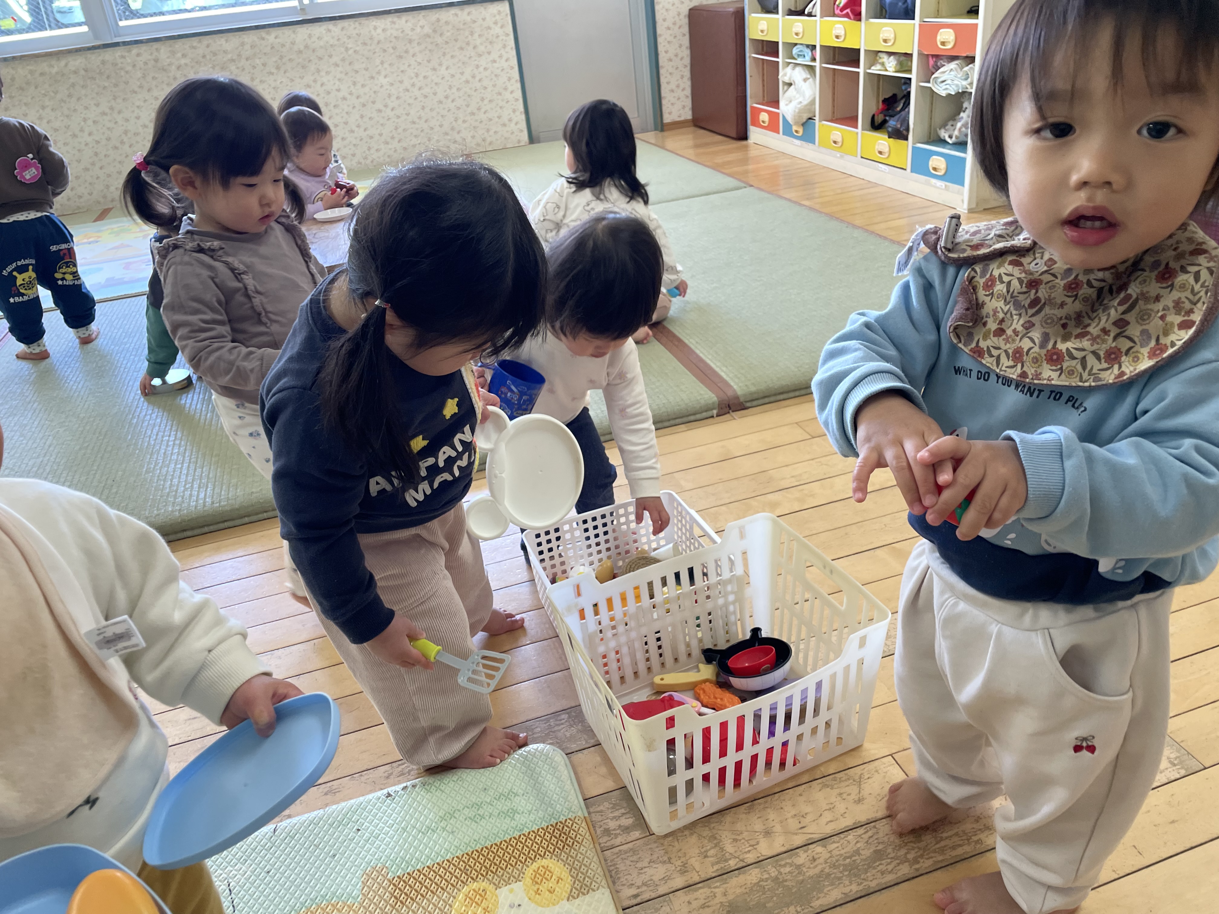 まだまだトラブルが多いもも組の子ども達ですが、ほとんどの子が友達の名前を覚えて呼び合いながら遊んでいます。ままごとで料理を作ったり、作ってもらったりして出来上がった料理はちゃんと”いただきます”をして食べていて、とっても楽しそうな声が聞こえています。このように友達との関わり方も上手になってきています。その姿を見守りながら、時には保育教諭も仲間に入って、楽しく過ごします。最近は更に出来る事が増え、お皿と食材をカゴに分けて片付けられるようになりました。「あってる?」と聞きながら入れたり、友達が間違えると「ちがうねぇ〜」と直してあげたり、カゴの前でどっちに入れるか考えたり、友達と競い合う様に楽しみながら片付けをしています。いろいろな事が出来るようになった子ども達ですが、まだまだ小さいもも組です。真似っ子大好きの子ども達には、進級に向けて少しでも自分で出来る事が増えるよう、見守ったり、そっと援助したりして、自信を持って笑顔で進級する事が出来るように、残り1週間過ごさせていきたいと思います。