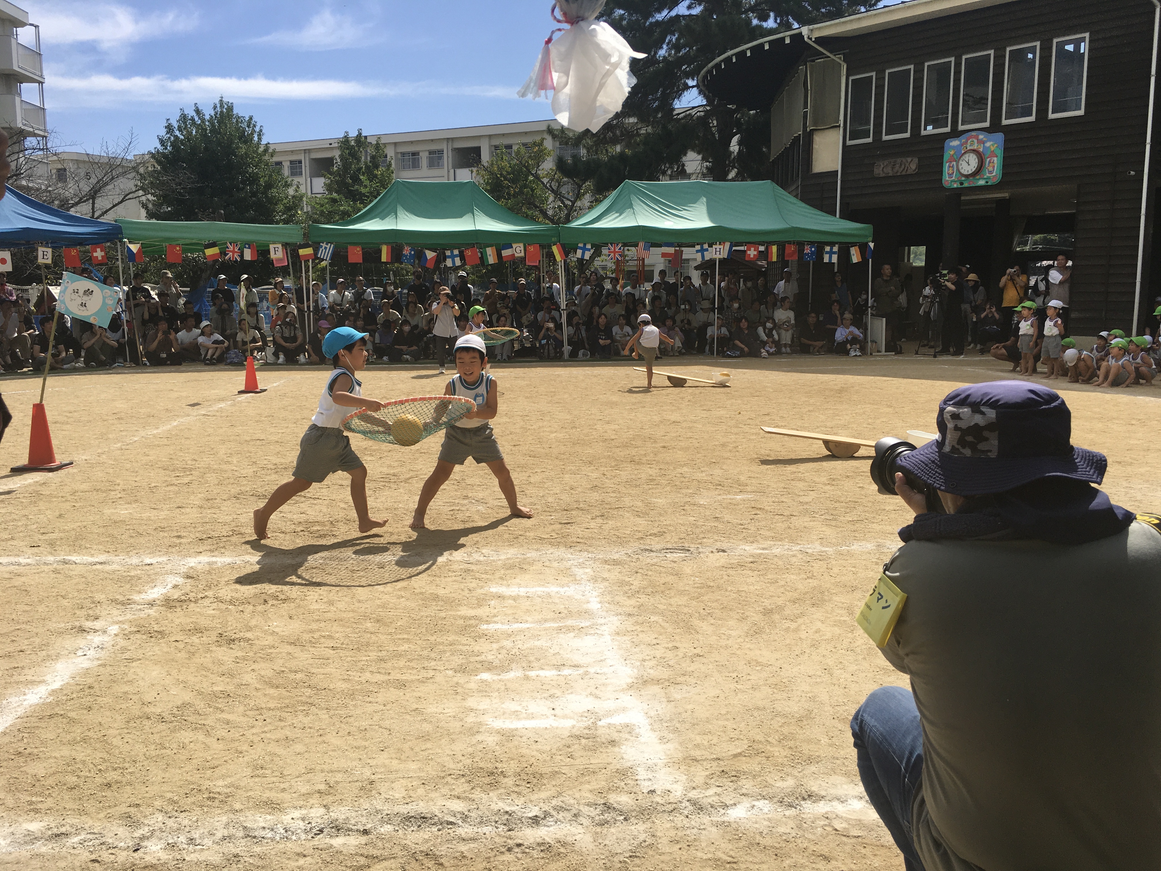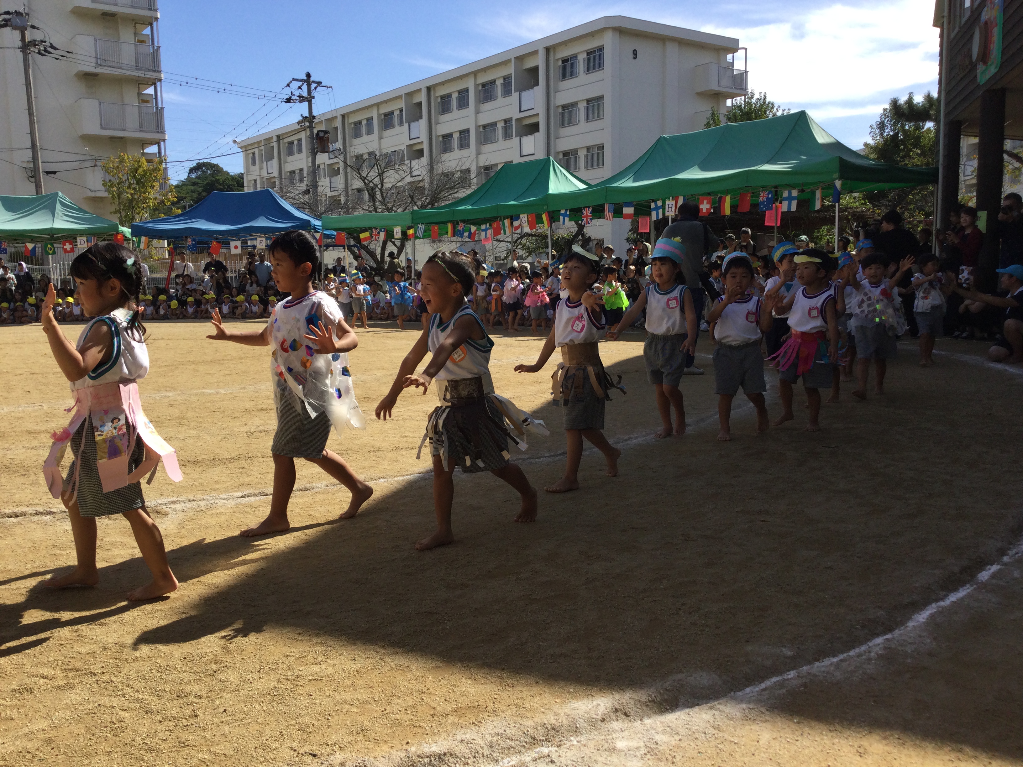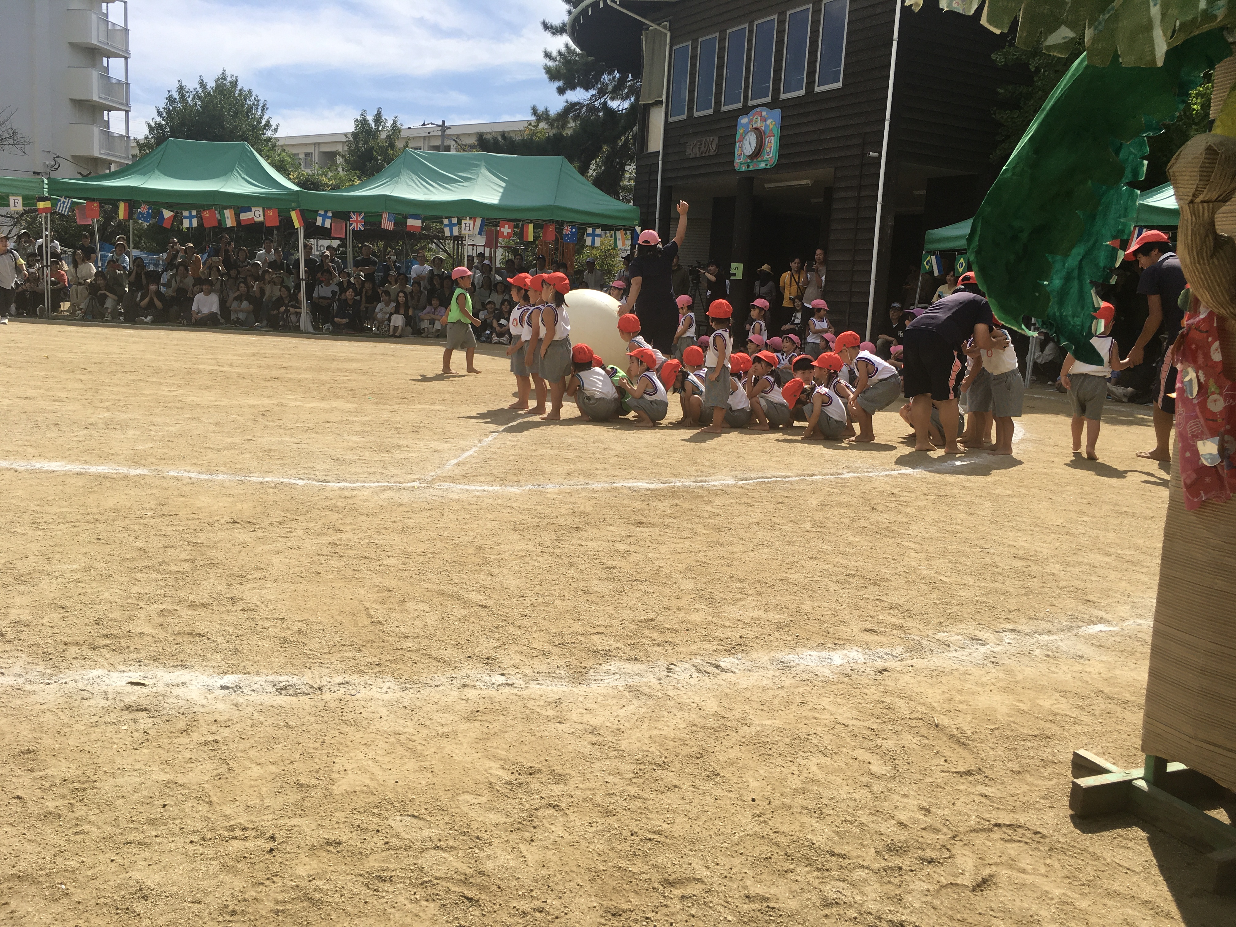 年中児のかけっこでは、特に自分の名前を丁寧に言う姿が見られました。「お父さん、お母さんが付けてくれた大事な名前だからね。お客さんに聞こえるように言おうね!」という古森先生の話をしっかりと聞いて、今日は全員が自分の名前を言うことができました。途中で転んでしまった子もいましたが、泣かずに最後まで走り切る姿にたくさんの拍手が送られました。競技「バーン!とキャッチ!」は、蹴り上げたボールを網でキャッチする競技です。ボールが高く上がったり上手くキャッチしたりすることができると、お客さんから「おー!」と歓声が上がりました。赤コースでは、ゴール目前で転んでしまい、泣きながらゴールした年中児を司会の年長さんが励ましていました。そして、勝敗は審議になったのですが、教師がどうしようかと困っていると空かさず進行の年長さんが「同点にしよう!」と判断し、その場を上手く納めてくれました。「ウキウキパレード」の踊りは、自分たちで準備した包装紙や紙袋、ビニール袋を使って衣装を作りました。子ども達手作りの衣装は、世界で一つだけの素敵な衣装で子ども達を更に輝かせていました。移動に困っている子がいると子ども同士で助け合い、元気いっぱい踊ることができました。実は2日前に「すぐに退場してしまったらもったいないよ!」と古森先生が提案してくれた退場の仕方は、子ども達がお客さんに笑顔で手を振り、オリンピックの入場行進さながらで年中組以外の保護者の方も拍手やハイタッチをしてくれて、子ども達はとても嬉しそうでした。