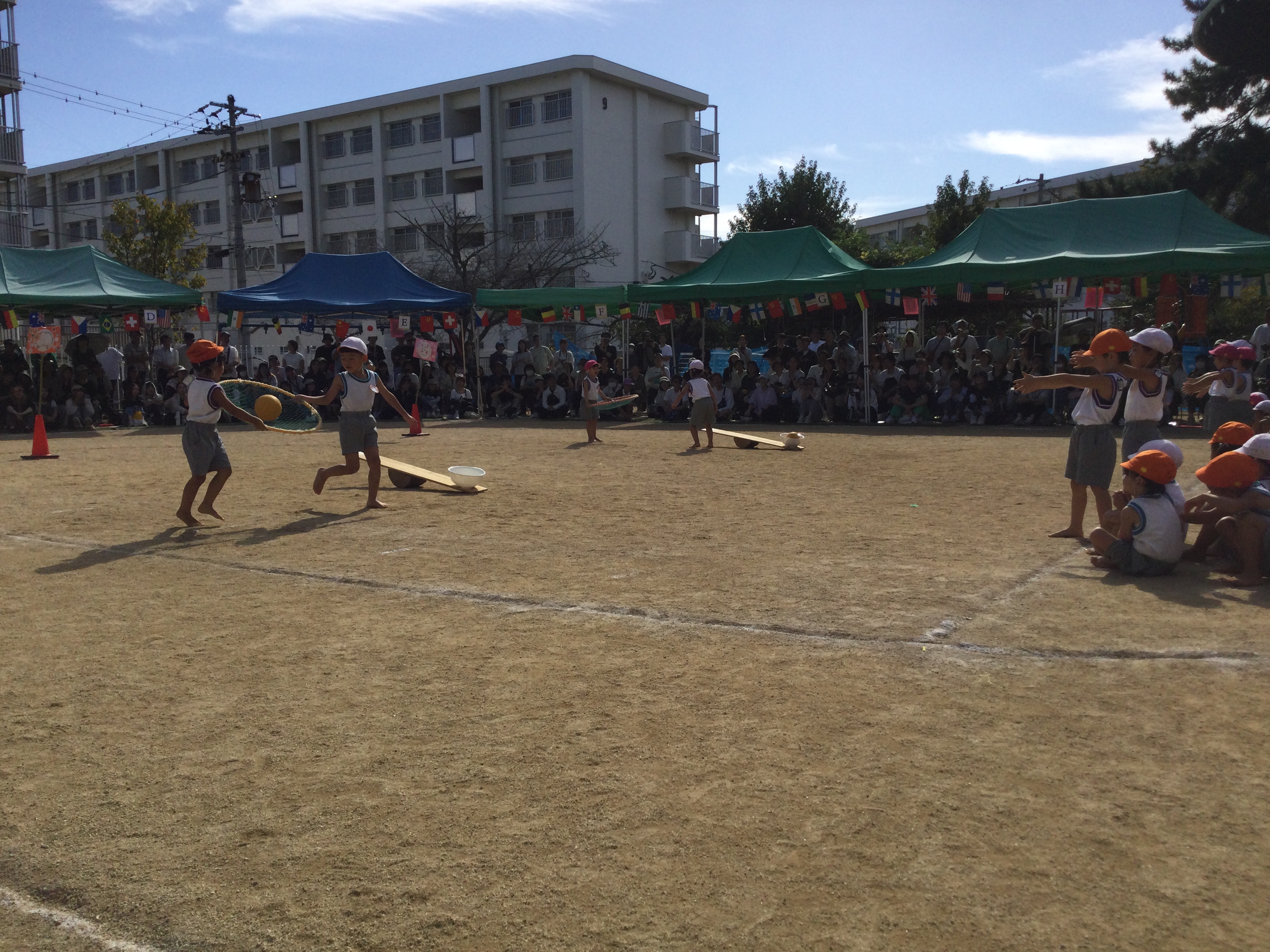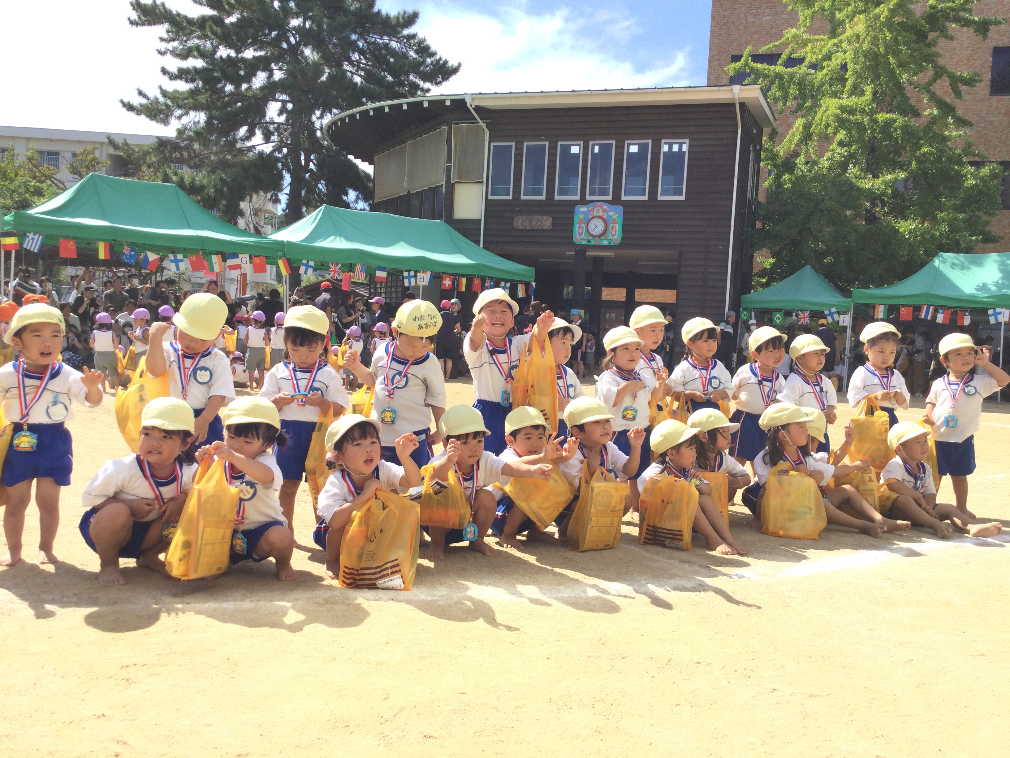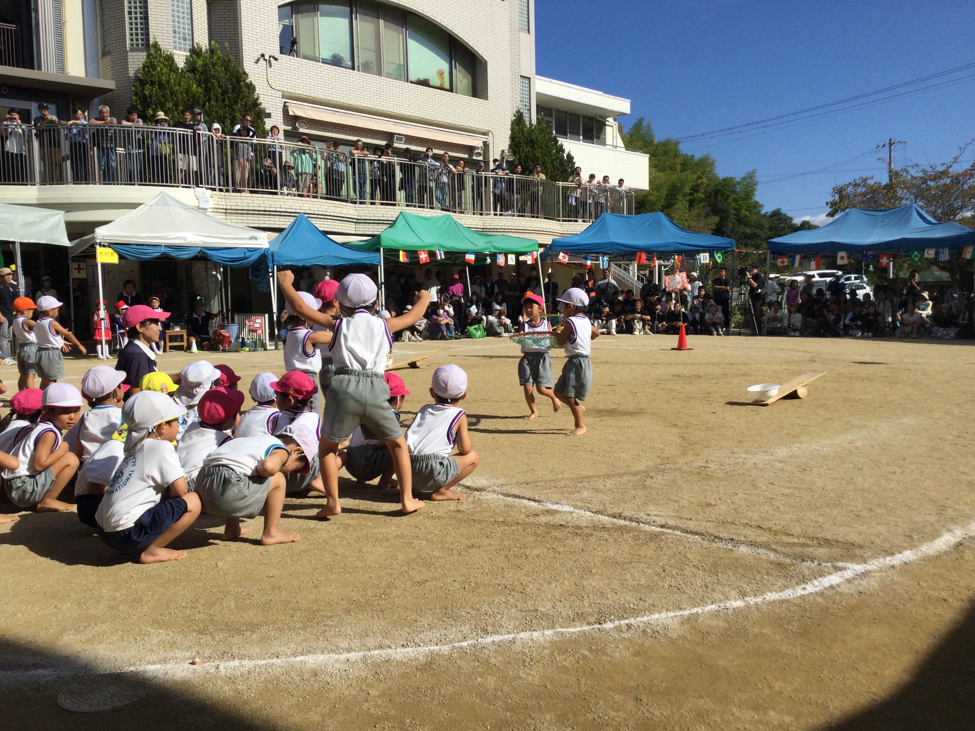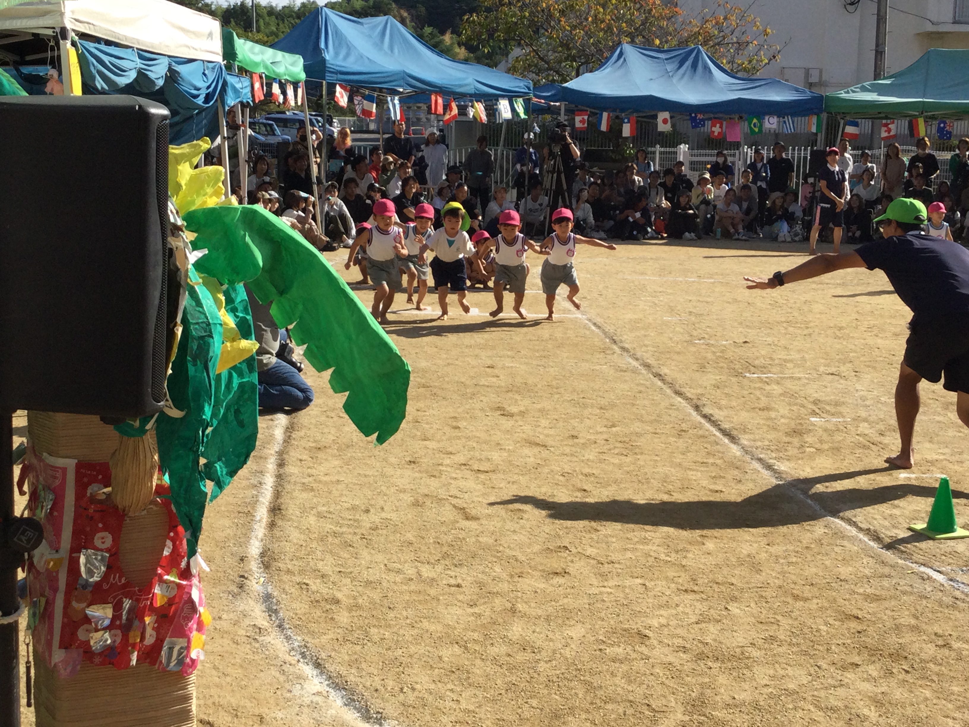 年中児のかけっこでは、特に自分の名前を丁寧に言う姿が見られました。「お父さん、お母さんが付けてくれた大事な名前だからね。お客さんに聞こえるように言おうね!」という古森先生の話をしっかりと聞いて、今日は全員が自分の名前を言うことができました。途中で転んでしまった子もいましたが、泣かずに最後まで走り切る姿にたくさんの拍手が送られました。競技「バーン!とキャッチ!」は、蹴り上げたボールを網でキャッチする競技です。ボールが高く上がったり上手くキャッチしたりすることができると、お客さんから「おー!」と歓声が上がりました。赤コースでは、ゴール目前で転んでしまい、泣きながらゴールした年中児を司会の年長さんが励ましていました。そして、勝敗は審議になったのですが、教師がどうしようかと困っていると空かさず進行の年長さんが「同点にしよう!」と判断し、その場を上手く納めてくれました。「ウキウキパレード」の踊りは、自分たちで準備した包装紙や紙袋、ビニール袋を使って衣装を作りました。子ども達手作りの衣装は、世界で一つだけの素敵な衣装で子ども達を更に輝かせていました。移動に困っている子がいると子ども同士で助け合い、元気いっぱい踊ることができました。実は2日前に「すぐに退場してしまったらもったいないよ!」と古森先生が提案してくれた退場の仕方は、子ども達がお客さんに笑顔で手を振り、オリンピックの入場行進さながらで年中組以外の保護者の方も拍手やハイタッチをしてくれて、子ども達はとても嬉しそうでした。