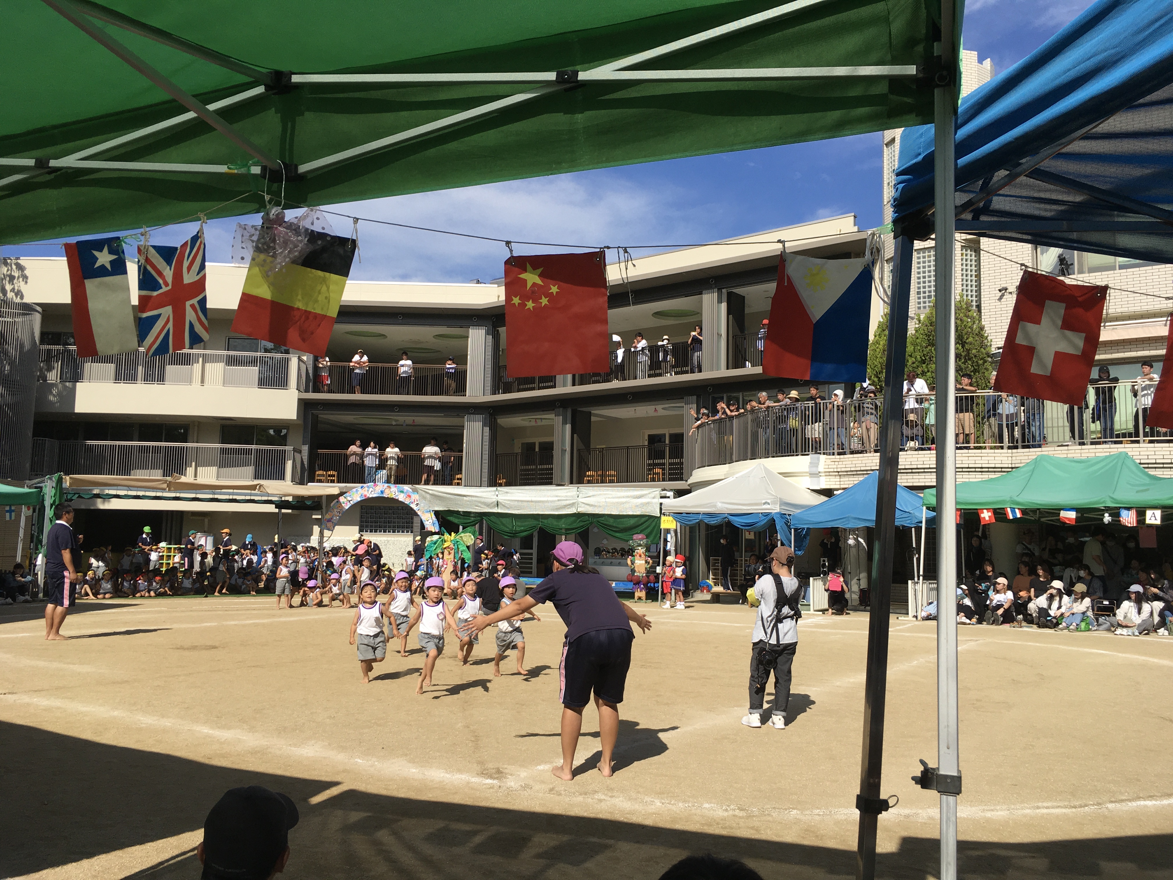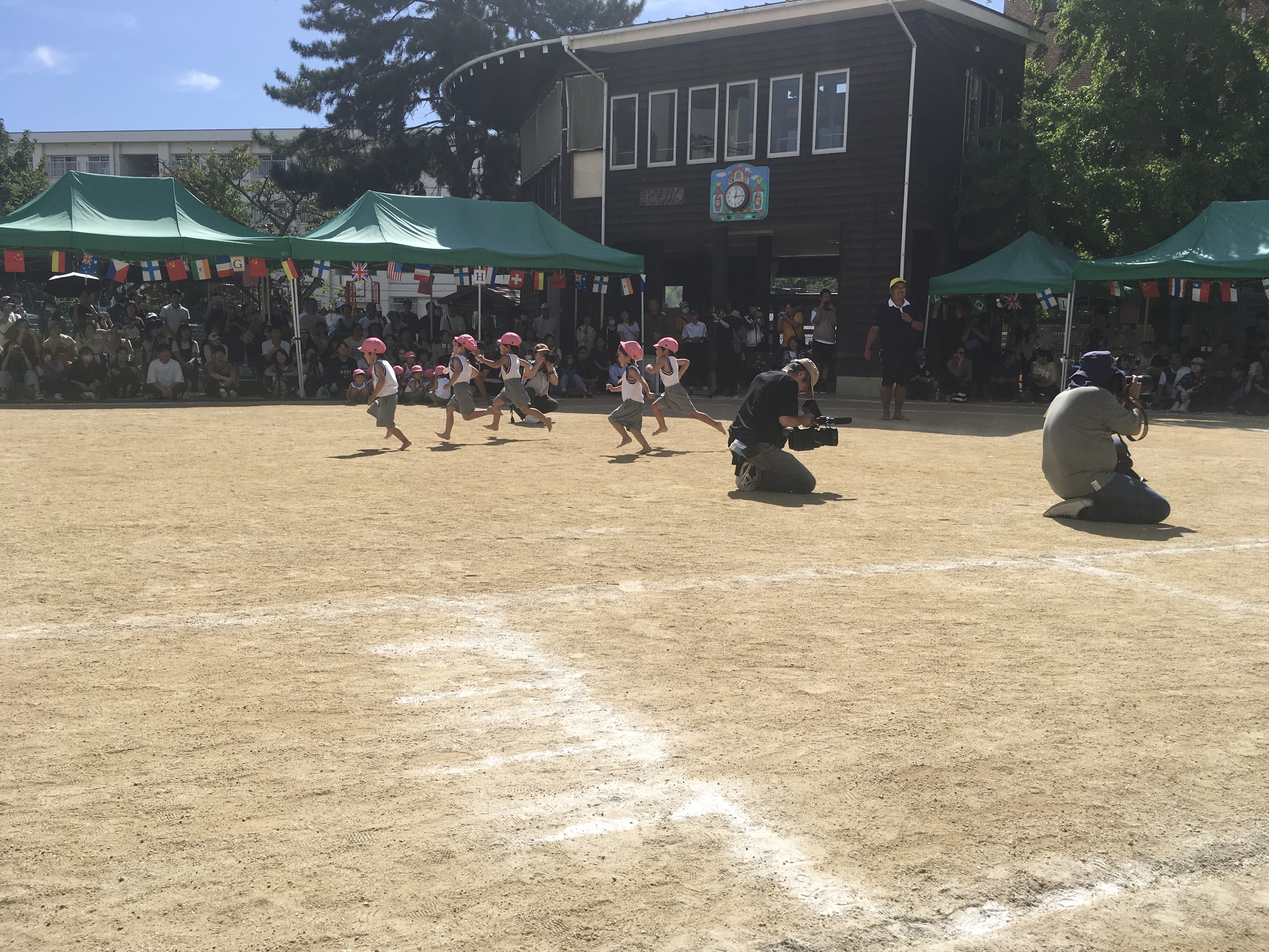 プレ年少児のダンスでは、泣いているプレ年少児にはお手伝いの年長児が一緒に踊ることで、全員が参加して踊ることができました。さくらんぼの帽子と衣装もとても可愛く、他の学年の子ども達が「チェリービーム♪」と声を掛けて応援してくれました。かけっこでは、プレ年少児も自分の名前をマイクで言います。進行の年長児の「よーい!」の合図に合わせてスタートを切ると、満面の笑みで手を広げて待っている先生の胸に飛び込んでいきました。たんぽぽ黄組には3歳を迎える前の2歳児もいるのですが、お手伝いの年中組のお兄さんお姉さんと手をつないで入場すると、元気よく走ることができました。
