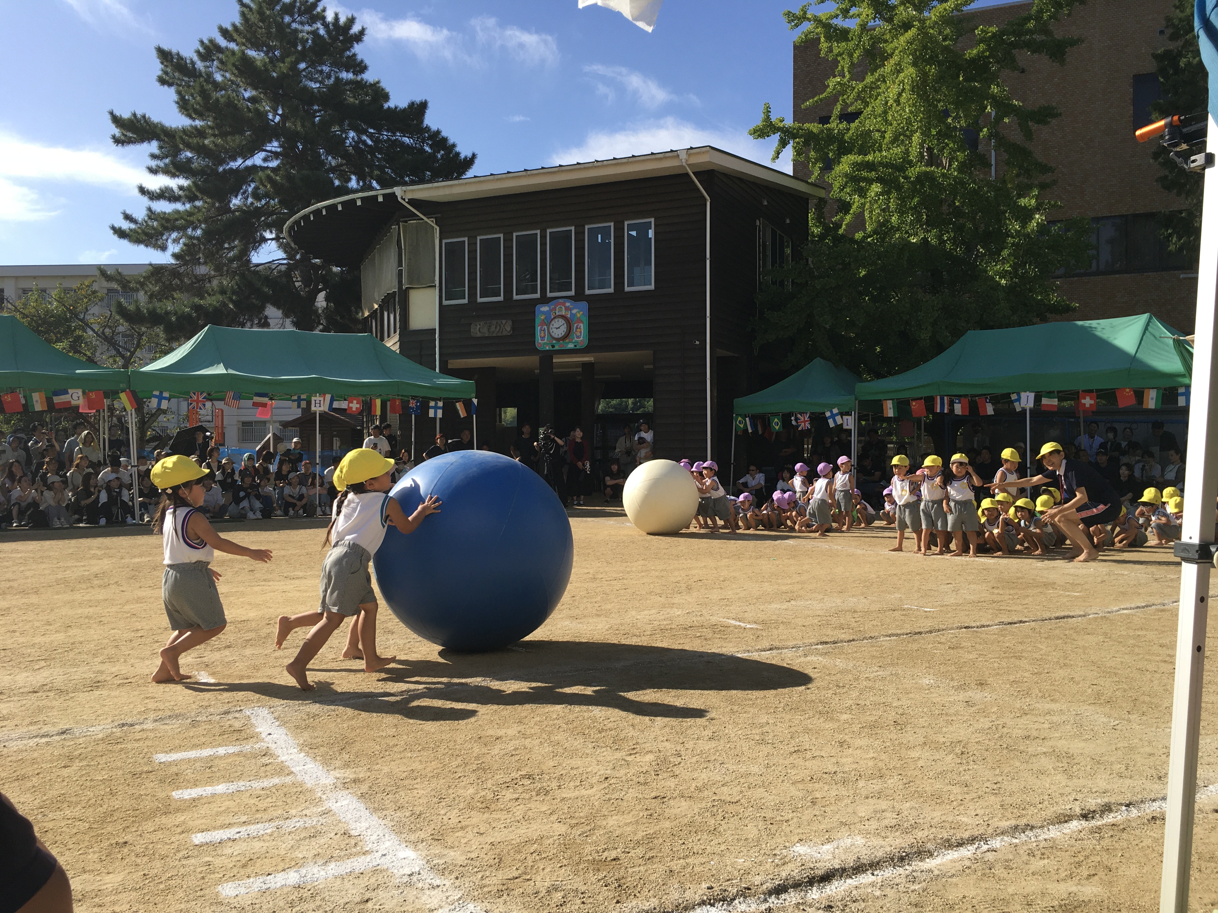 年少児の競技「ころがせ げんきだま!」は、3人一組で力を合わせて大玉を転がしました。3人であちこちへ転がる大玉を操作しながら、器用に折り返しの旗を回っていくのですが、旗に大玉が引っかかってしまうグループにはお手伝いに参加していた年長さんが倒れそうになった旗にそっと手を添えて援助し「こっち!こっち!」と手招きをして誘導します。競技を邪魔しない絶妙な援助に教師達は感心するばかりでした。ダンス「バナナ バネバネ」は、クラスみんなで手をつないで円を作ったり、担任と自由隊形で踊ったりして「先生と一緒に踊れて楽しかったよ!」と大満足の様子でした。かけっこでも、年少児になると自信をもって自分の名前を言うことができます。三葉幼稚園の運動会では、自分の名前をマイクで言うのですが、これは園外で迷子になった時などにきちんと自分の名前を言える社会性や力を身につけたいというねらいもあります。転んだ子もいましたが、最後まで走り切ることができました。