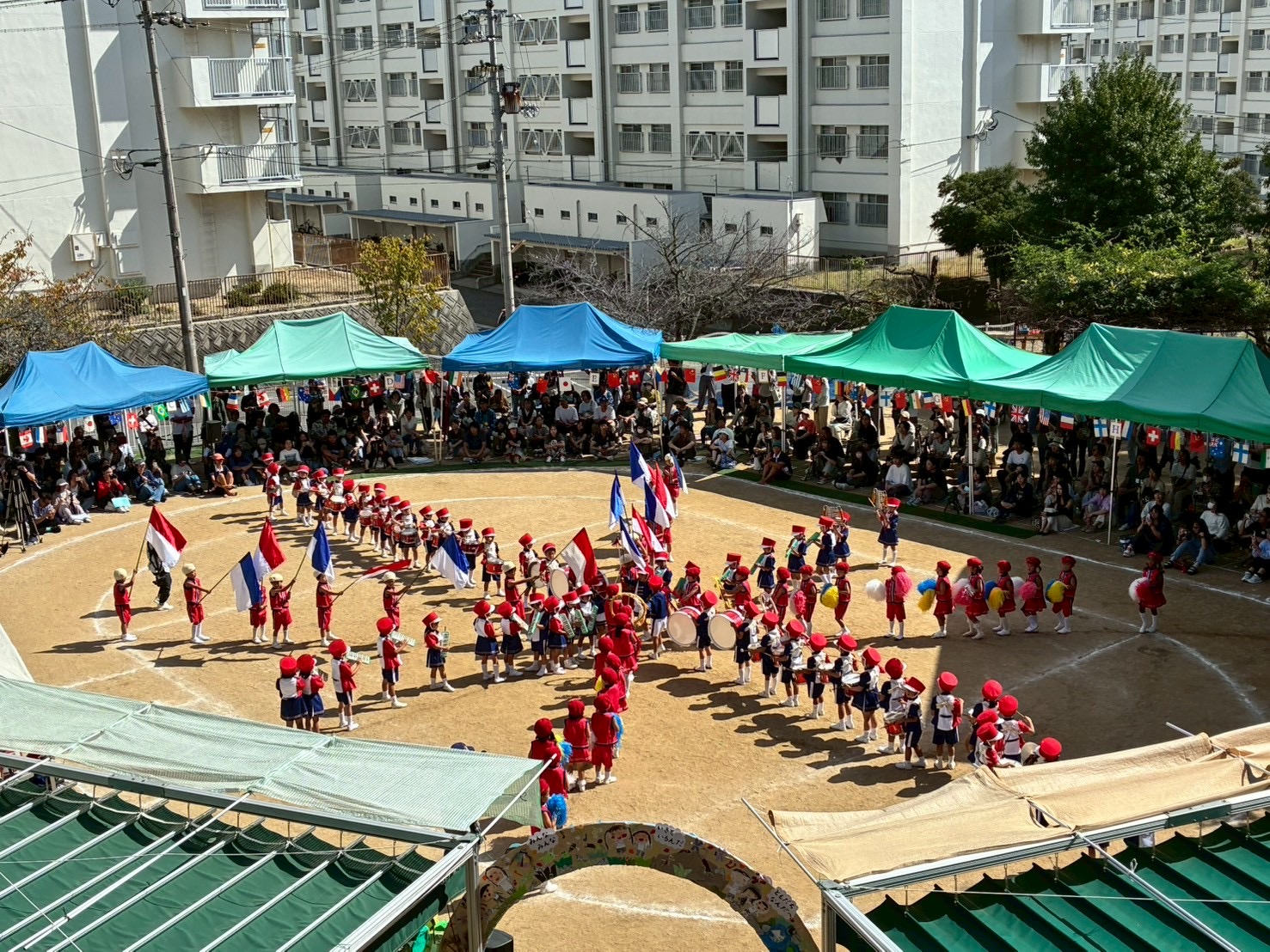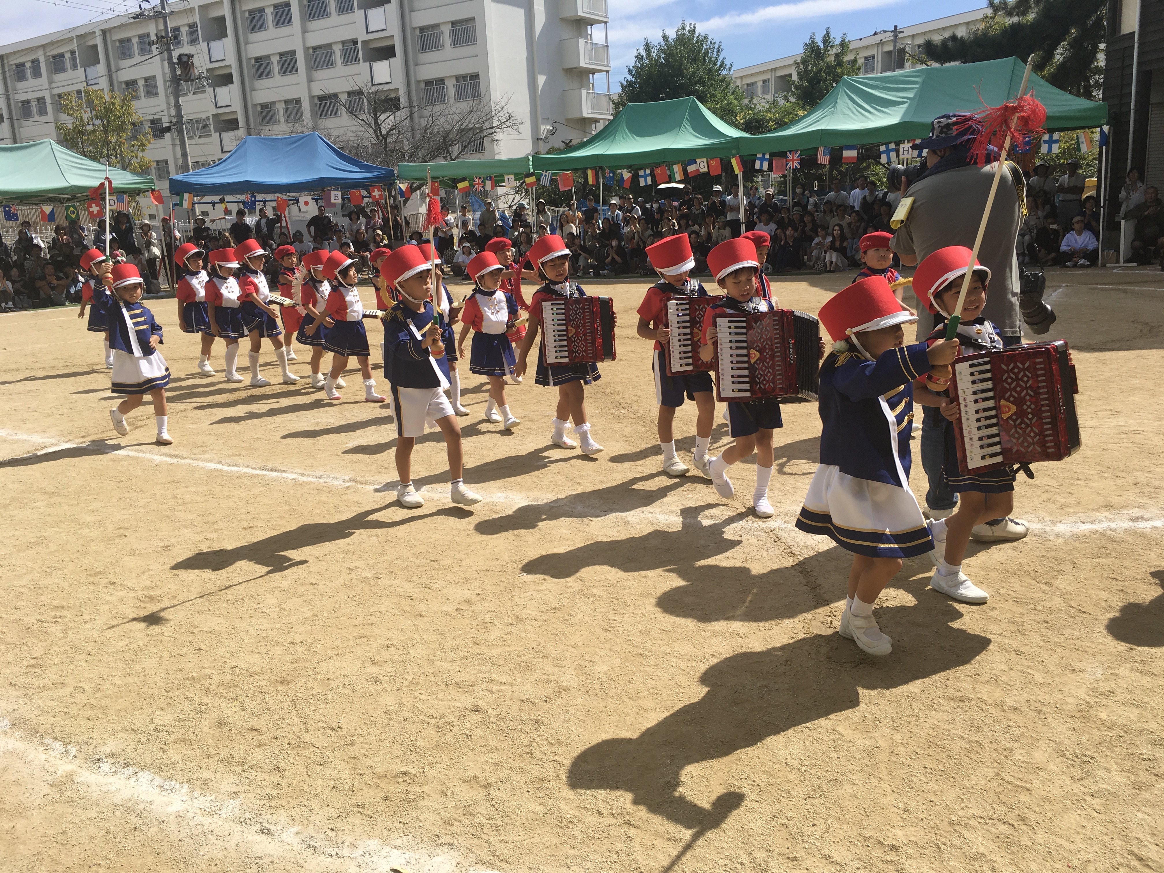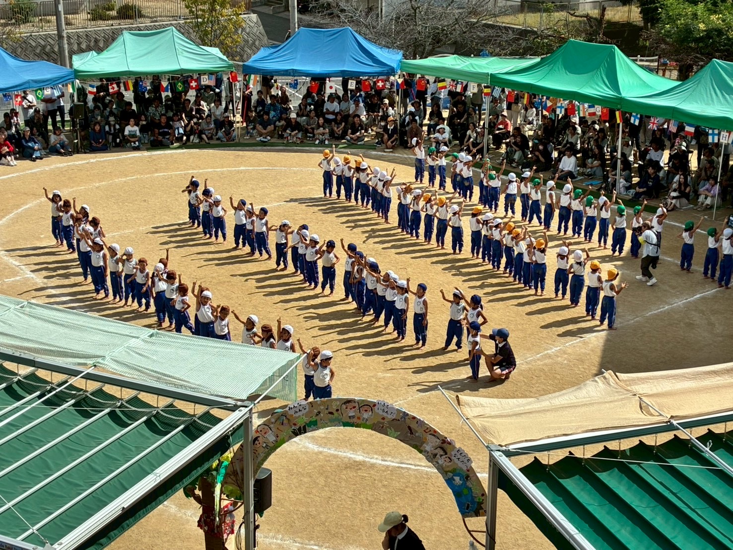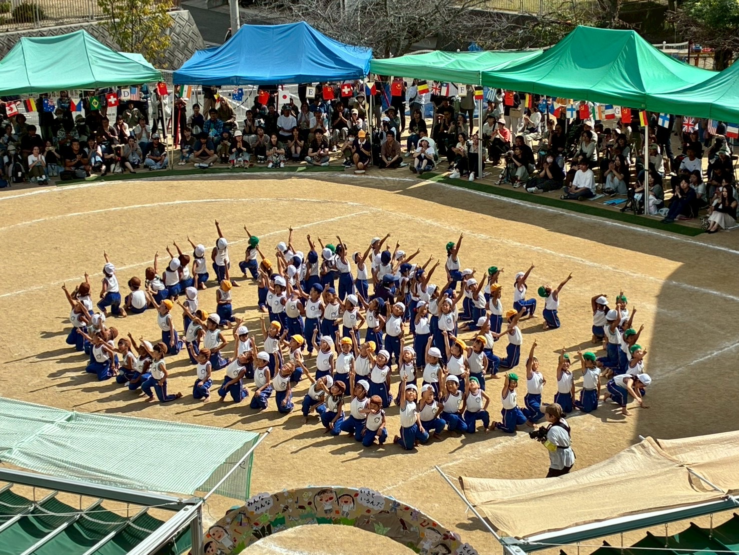 年長組の組体操は久しぶりに運動会に復活した演目でした。実は組体操で使われた「あとひとつ」は、今年の夏の甲子園で沖縄県が優勝した時にちょうど流れていた曲で、古森先生と年長組の担任が話し合って選曲しました。今日の本番では、手話を交えて表現し、空を真っすぐに指差し見つめる眼差しや年長児の姿に涙する保護者の姿がありました。9月には感染症が拡がり、年長児みんなが揃って練習することが難しい時期がありましたが、そんな時を乗り越えて今日はみんなが揃って笑顔で表現することができました。また、「砥部の山、かかし、団子、バナナ」などの組体操の形は自分達で考え、三葉らしく面白い表現になりました。鼓笛隊は、今年新しい衣装を新調し、雰囲気もとても素敵なものになりました。練習はヨーロッパの兵隊や自衛隊のパレードを見るところから始まりました。残暑の厳しい暑さの中では、十分な戸外での練習ができませんでしたが「97名みんなで頑張る!お父さんやお母さん、先生の心をいっぱいにする!」を合言葉に空いている時間や朝の涼しい時間を使って、自分達で進んで練習をしてきました。「歌を歌うことで太鼓のリズムも合うようになるよ!」という古森先生のアドバイスも生かして、みんなの心(音)を一つにして演奏することができました。クラス対抗リレーでは、怪我のために車椅子で参加した子も含め、全員で競い合いました。走るのが得意な子、苦手な子、怪我をして十分に走れない子等、子ども達が助け合い補い合いながら、全員がバトンをつないでゴールを目指しました。保育園、幼稚園を通して5年間を三葉幼稚園で過ごしてきた「みつば5年生」が多い年長児達。三葉幼稚園の最年長児らしい立派な姿にたくさんの声援や感動の拍手が送られました。
