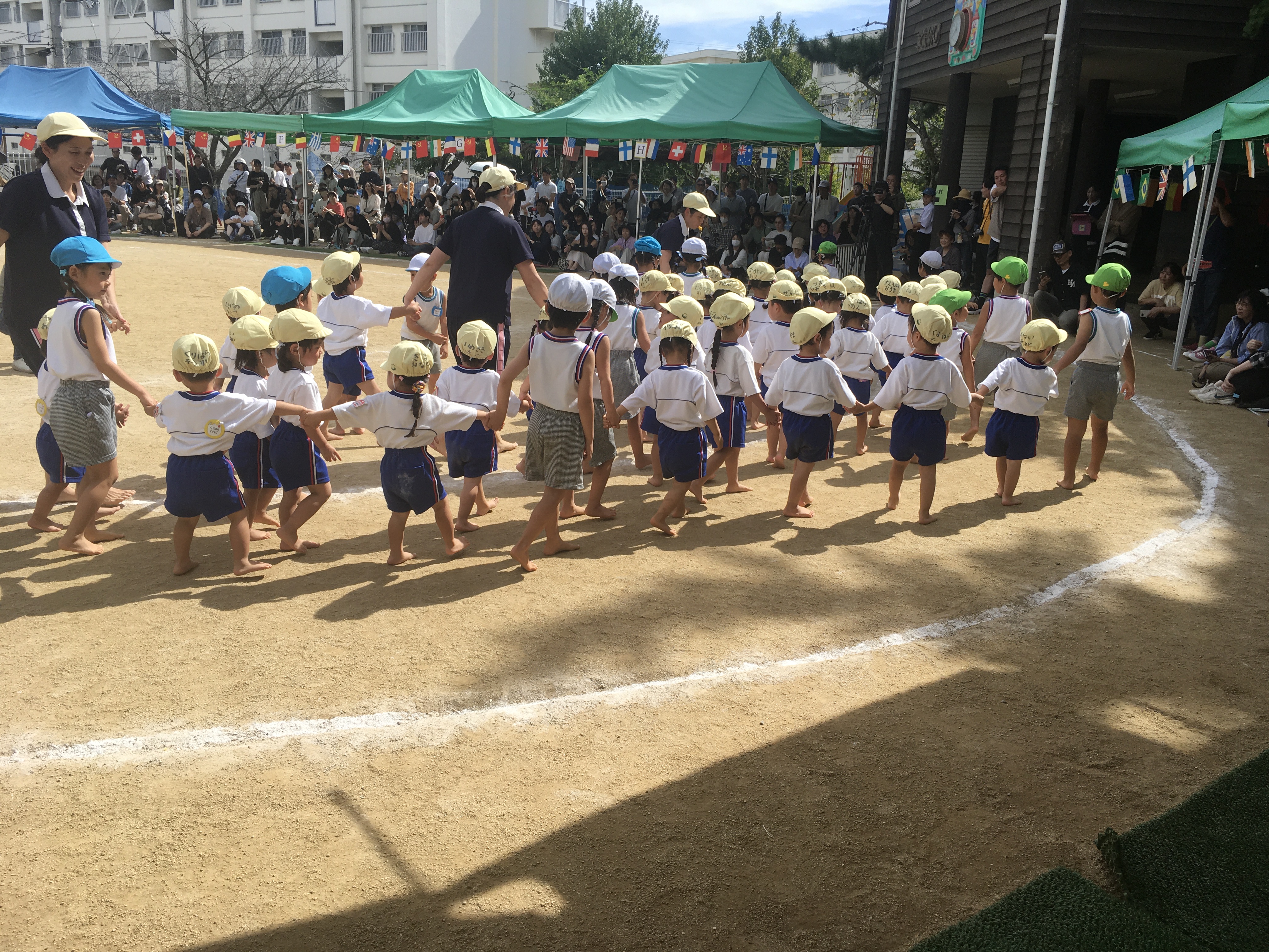 踊りが終わると古森先生の提案でトラックを回って手を振りながら歩く年中さんの可愛いパレードはまるでオリンピック選手気取りです。それを見てプレ年少さんも年中さんの後を手を振りながら付いていきます。とっても可愛いプレ年少さんのパレードに周りで遊んでいる子も足を止め、手を振っていました。それが嬉しくなったプレ年少さんは、手を振ってくれたこの近くまで行ってハイタッチ!誰もが幸せになるパレードでした。